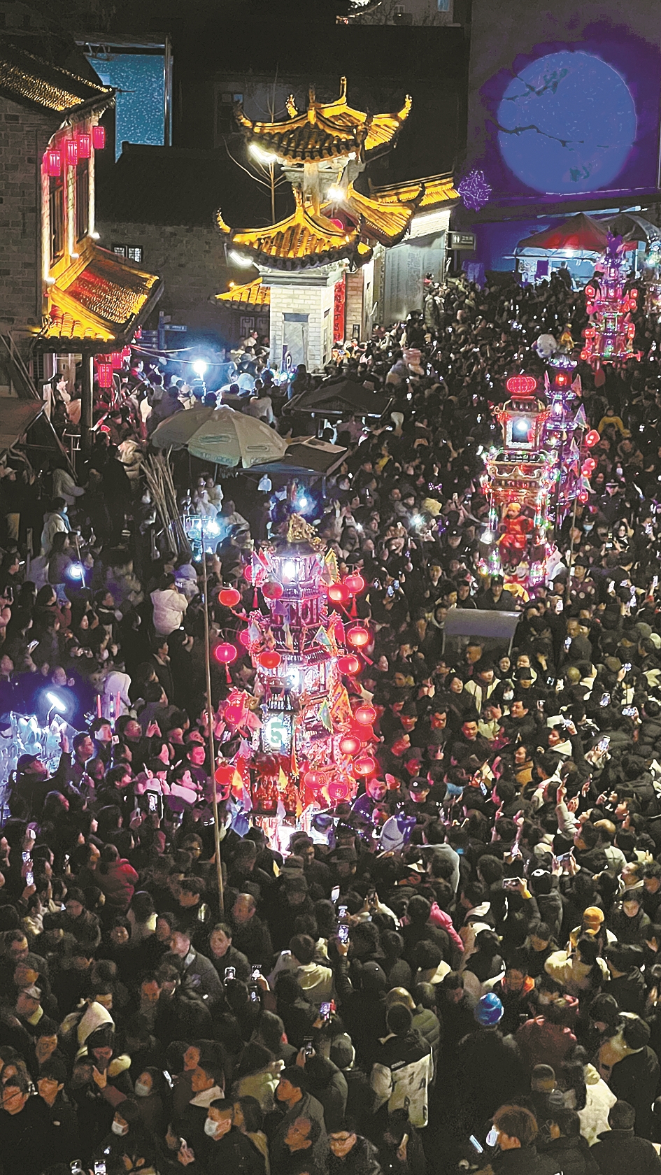 “祖先认为,‘取金能生水’,前童因水而兴,所以金属制的乐器在节日庆典中必不可少。”国家级非物质文化遗产代表性项目元宵节(前童元宵行会)传承人童全灿说。钲声引路、鼓乐喧天,浩荡的游街队伍制造出恰似百万军马的气势,还能像爆竹一样驱赶“年兽”或外敌。