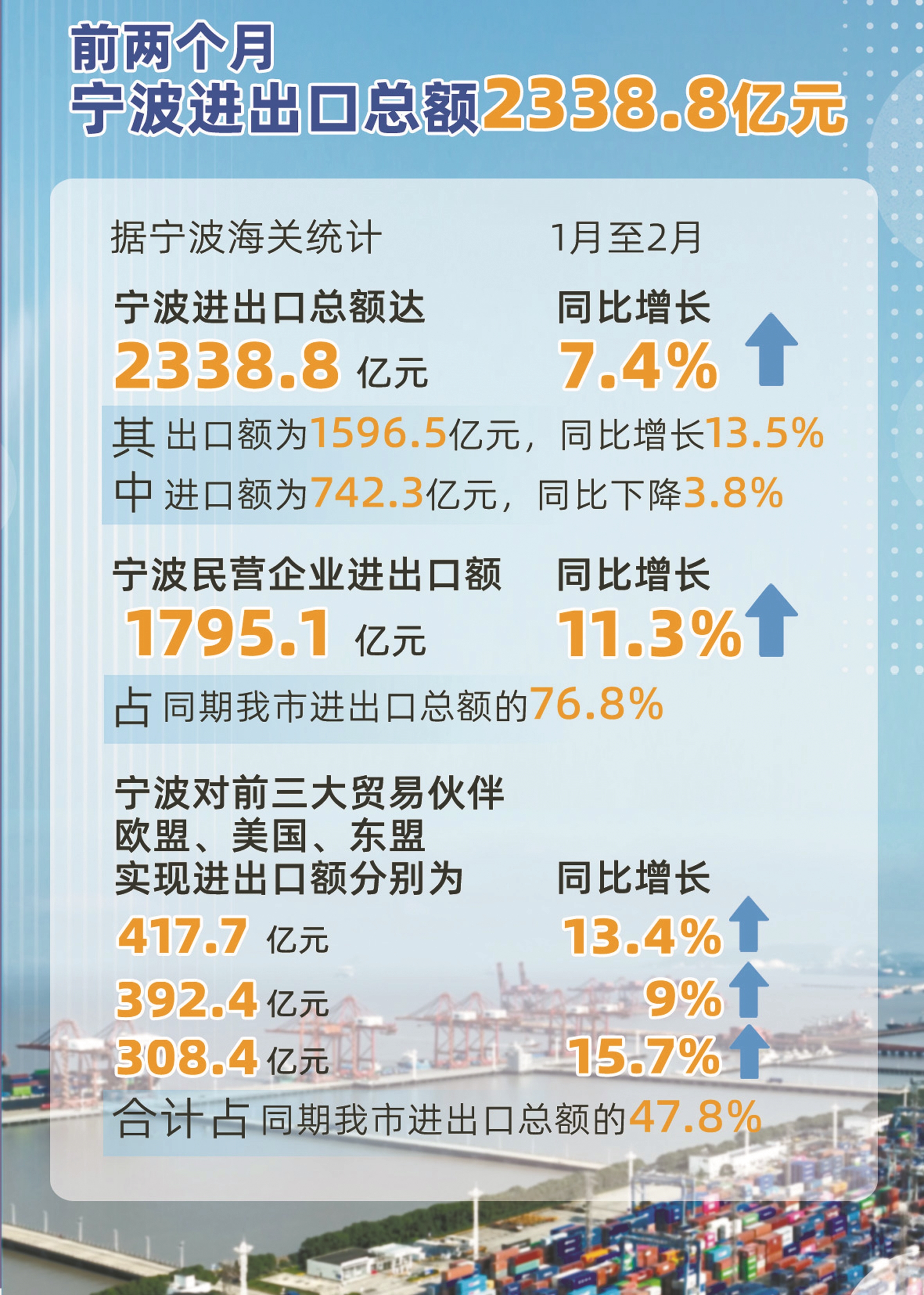 宁波顶着新一轮“压力测试”,交出了开年第一份“成绩单”——据宁波海关统计,1月至2月,宁波进出口总额达2338.8亿元,比去年同期增长7.4%,创历史同期新高。其中,出口额1596.5亿元,进口额742.3亿元,同比增速均明显高于全国平均水平。