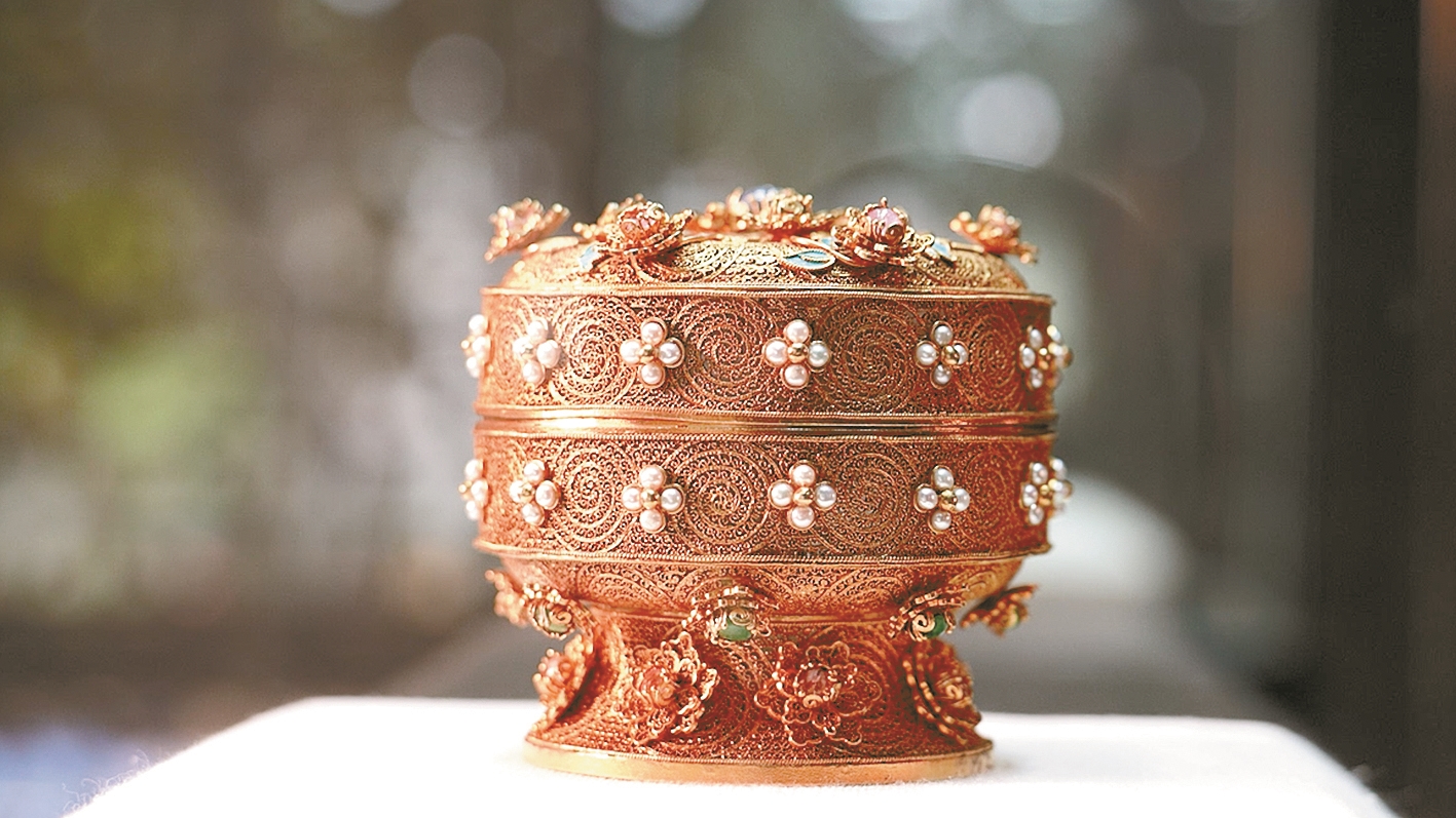 “采金为丝,妙手编结;嵌玉缀翠,是为一绝。”花丝镶嵌,又称“细金工艺”,是花丝和镶嵌两门技艺的结合。它的前身是春秋战国时期的金银错工艺,后成熟于唐宋时期,至明清达到高峰。过去,花丝镶嵌由于工艺繁复、用料昂贵,多用于宫廷,鲜为百姓所知。近现代以来,这项技艺的传承逐渐式微。