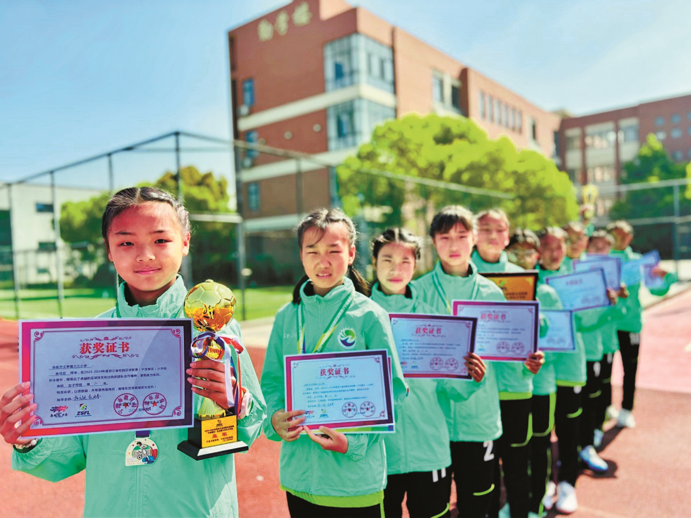 余姚市丈亭镇三江小学从2017年开始发展校园足球,现在是全国青少年校园足球特色学校。在去年4月结束的2023—2024年度浙江省校园足球联赛(宁波赛区)中,该校赢得女子甲组亚军,晋级省级联赛。