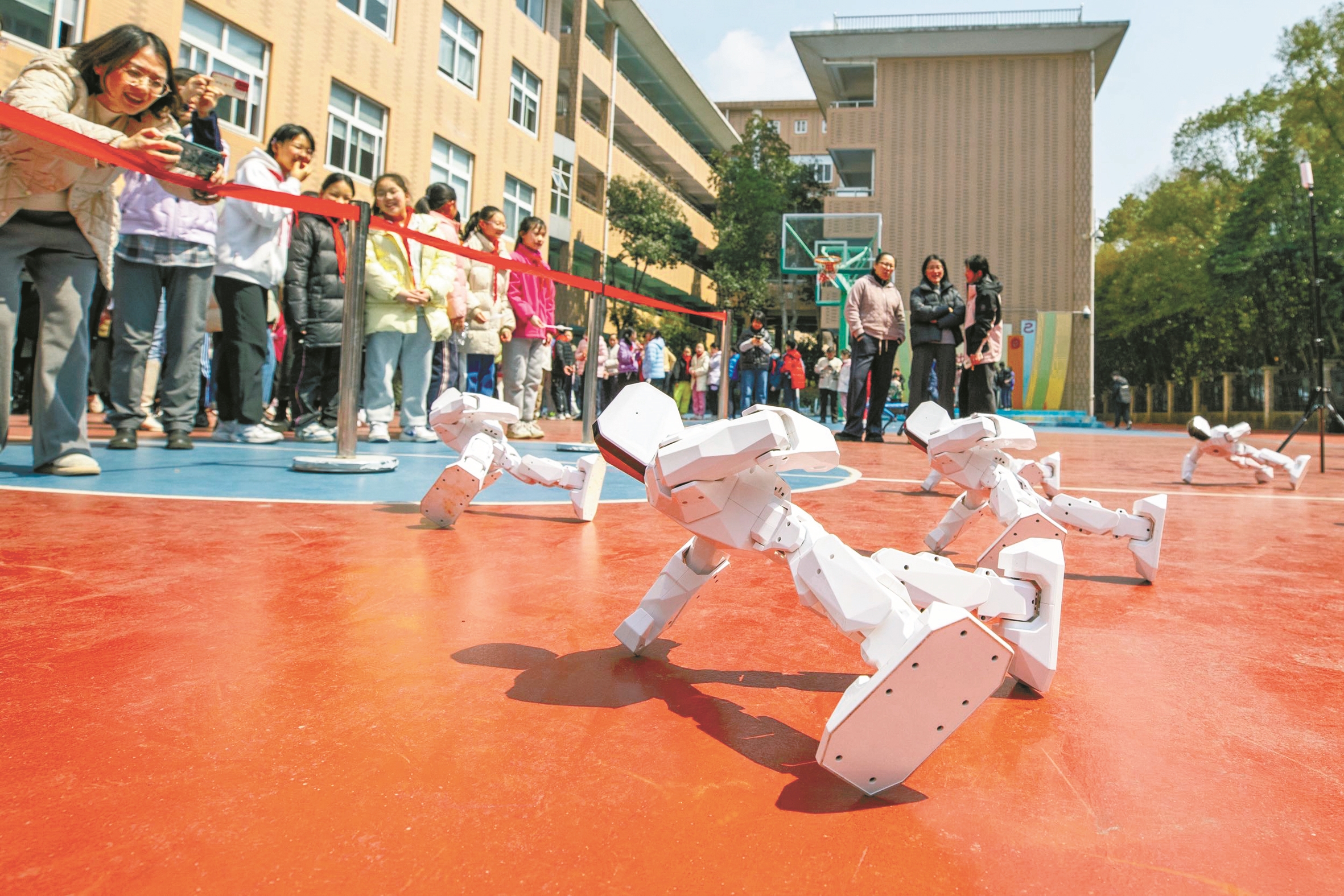 “太神奇啦!机器人居然还能翻跟头!”昨日,宁波市实验小学操场上欢声笑语不断,一场以“智慧无限·创见未来”为主题的科创文化节正在举行。一群特殊的机器人“嘉宾”的到来,瞬间点燃了孩子们的兴趣和热情。大家满怀好奇与兴奋,围聚在一起观看机器人表演,感受科技的魅力。
