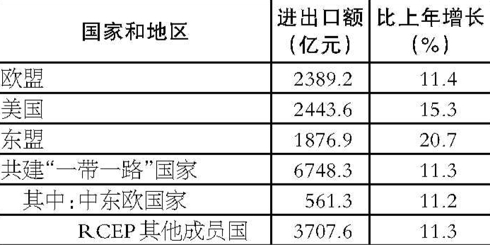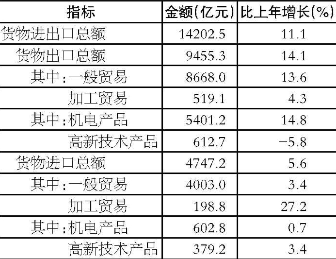货物贸易。全年口岸进出口25448.0亿元,比上年增长6.1%。货物进出口14202.5亿元,增长11.1%,占全国比重为3.24%。其中,出口9455.3亿元,增长14.1%;进口4747.2亿元,增长5.6%,规模分别居全国城市第五、第四和第六位。全年有进出口实绩的企业2.9万家。直接与我市开展贸易往来的国家和地区达233个。其中,对美国、欧盟和东盟分别完成进出口额2443.6亿元、2389.2亿元和1876.9亿元,分别增长15.3%、11.4%和20.7%,三者合计占进出口总额的47.2%;对共建“一带一路”国家进出口额6748.3亿元,增长11.3%。