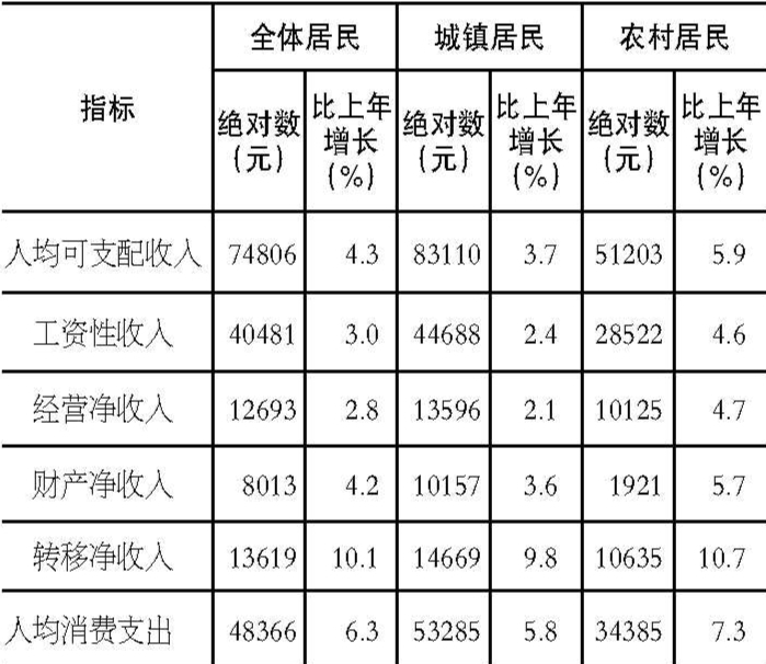 居民收支。根据城乡一体化住户调查,全年居民人均可支配收入74806元,比上年名义增长4.3%,扣除价格因素实际增长3.7%。按城乡分,城镇居民人均可支配收入83110元,名义增长3.7%,实际增长3.1%;农村居民人均可支配收入51203元,名义增长5.9%,实际增长5.3%。城乡居民人均收入倍差为1.62。全年居民人均消费支出48366元,增长6.3%。按城乡分,城镇居民人均消费支出53285元,增长5.8%;农村居民人均消费支出34385元,增长7.3%。