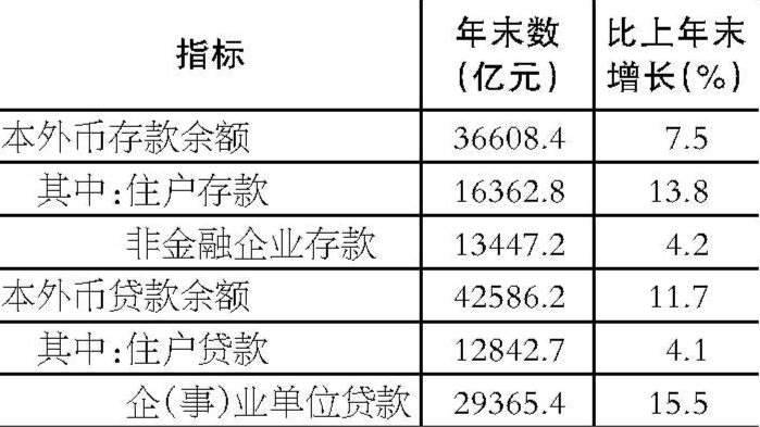 金融业。年末全市拥有银行业金融机构68家。其中,政策性银行3家,大型银行5家,股份制商业银行12家,城市商业银行13家,邮储银行1家,外资银行7家,农村合作金融机构9家,新型农村金融机构12家,非银行金融机构6家。年末金融机构本外币存款余额36608.4亿元,比上年末增长7.5%,其中人民币存款余额增长7.2%;本外币贷款余额42586.2亿元,增长11.7%,其中人民币贷款余额增长12.3%。