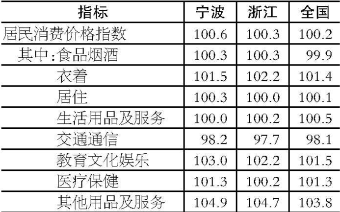 市场价格。全年市区居民消费价格比上年上涨0.6%。分类别看,食品烟酒价格上涨0.3%,衣着价格上涨1.5%,居住价格上涨0.3%,生活用品及服务价格持平,交通通信价格下降1.8%,教育文化娱乐价格上涨3.0%,医疗保健价格上涨1.3%,其他用品及服务价格上涨4.9%。工业生产者出厂价格下降2.1%,工业生产者购进价格下降1.8%。