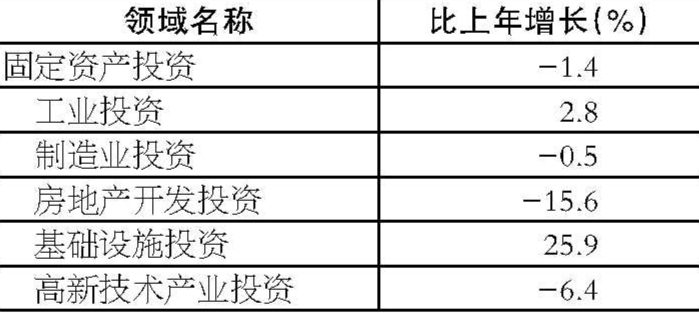 固定资产投资。全年固定资产投资比上年下降1.4%。其中,第二产业投资增长2.8%,第三产业投资下降2.7%。基础设施投资增长25.9%,占全部投资的比重为29.2%,比上年提高6.3个百分点,其中交通能源水利增长37.6%。工业投资增长2.8%,其中制造业投资下降0.5%。