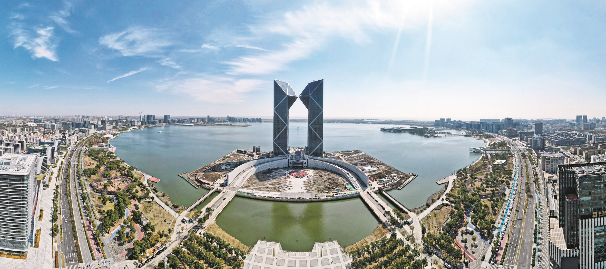 3月19日,空中俯瞰位于临港新片区滴水湖畔的中银金融中心大楼(无人机全景照片)。