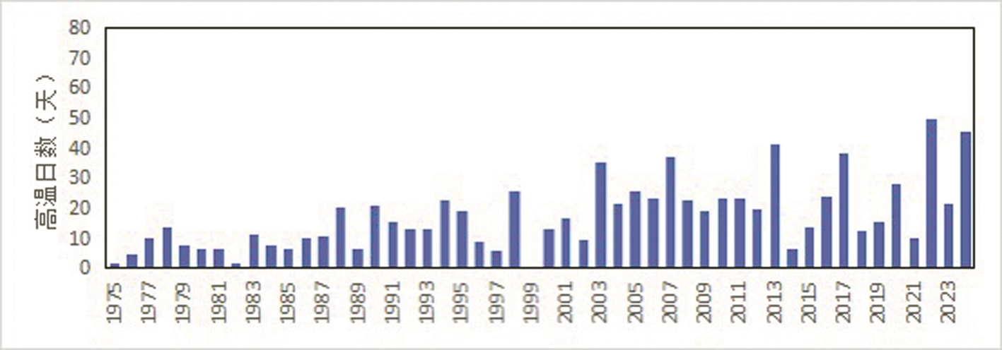 1975年至2024年,宁波夏季平均气温27.1℃,但波动幅度持续扩大。最热的2022年夏季平均气温达29.2℃,比最低年份(1982年、1999年)高出3.7℃。高温日数的变化更具冲击性:50年间全市夏季平均高温日数(≥35℃)17.7天,但2022年飙升至50天,而1999年仅0.6天。日最高气温超过40℃的极端高温日于2003年首次出现,2013年以6.9天创下纪录。