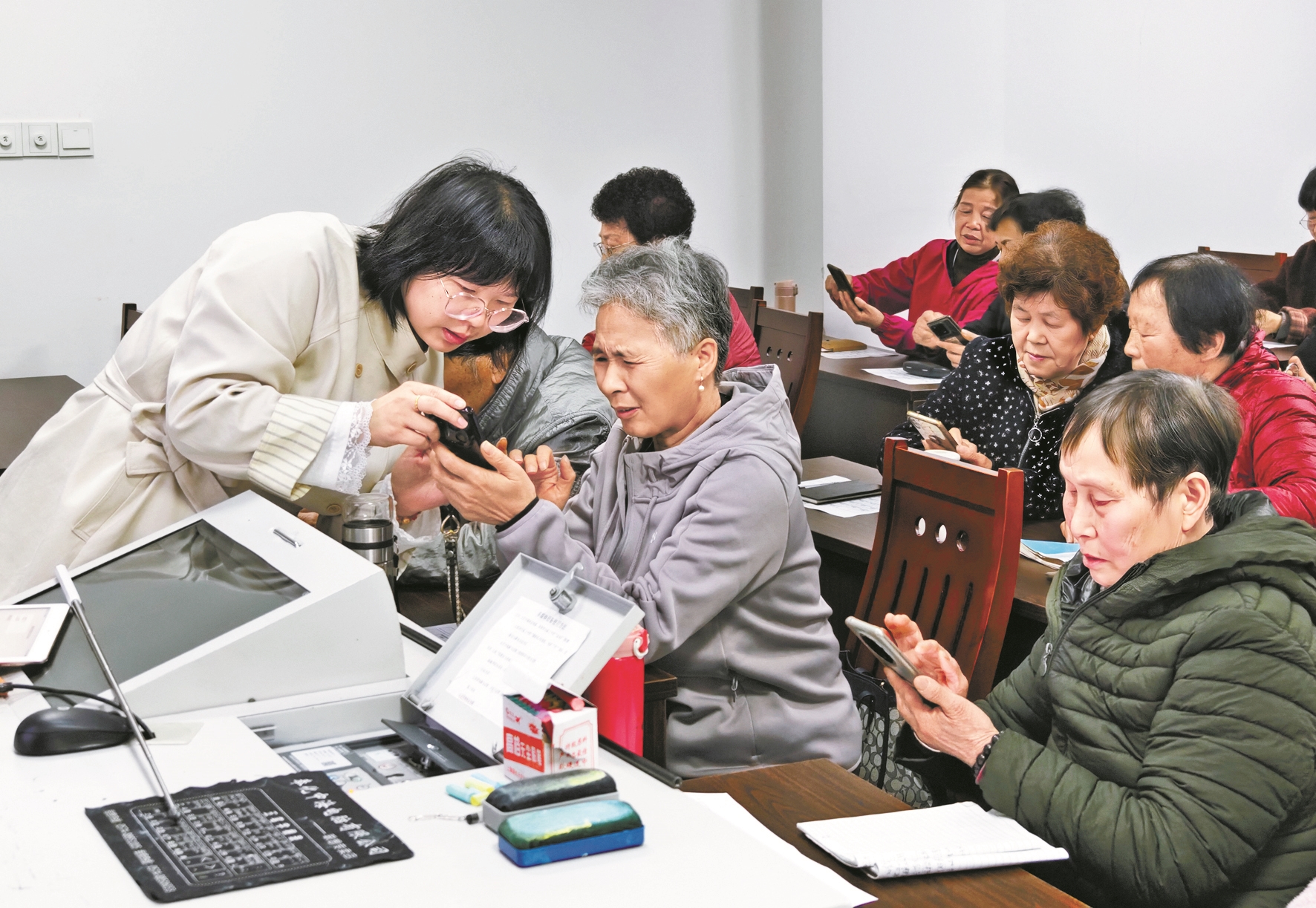 奉化老年大学学员正在学习使用智能手机。(陈章升 马雪红 摄)