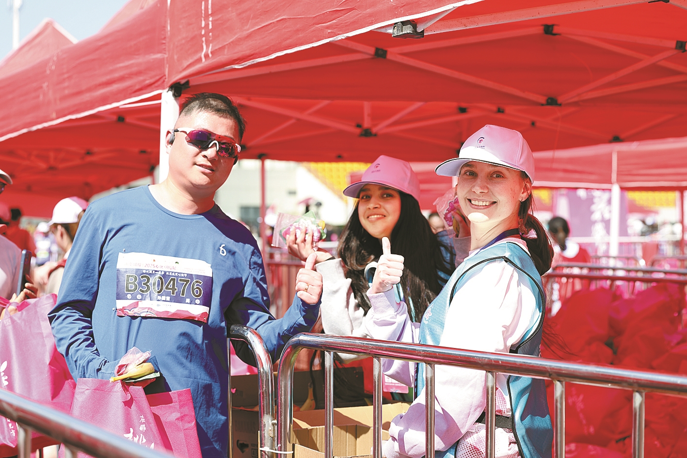On March 22, during the 2025 Fenghua Marathon, a team of 16 international and Chinese student volunteers from Ningbo University's Business School stood out in their peach-pink uniforms as a vibrant presence along the marathon course.