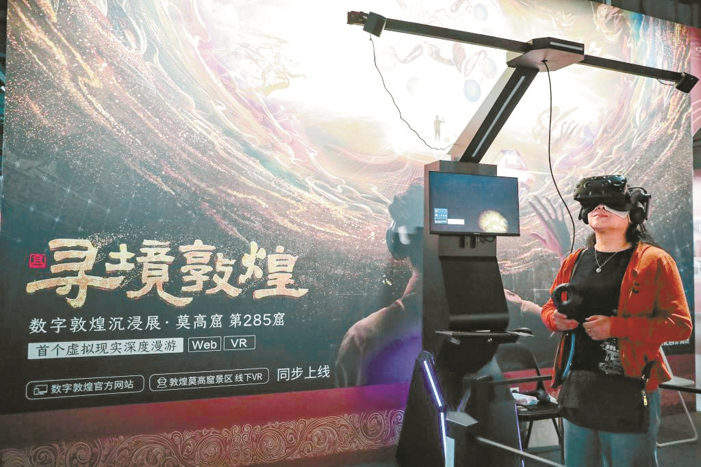 游客借助VR设备沉浸式游览莫高窟第285窟虚拟场景(新华社发)