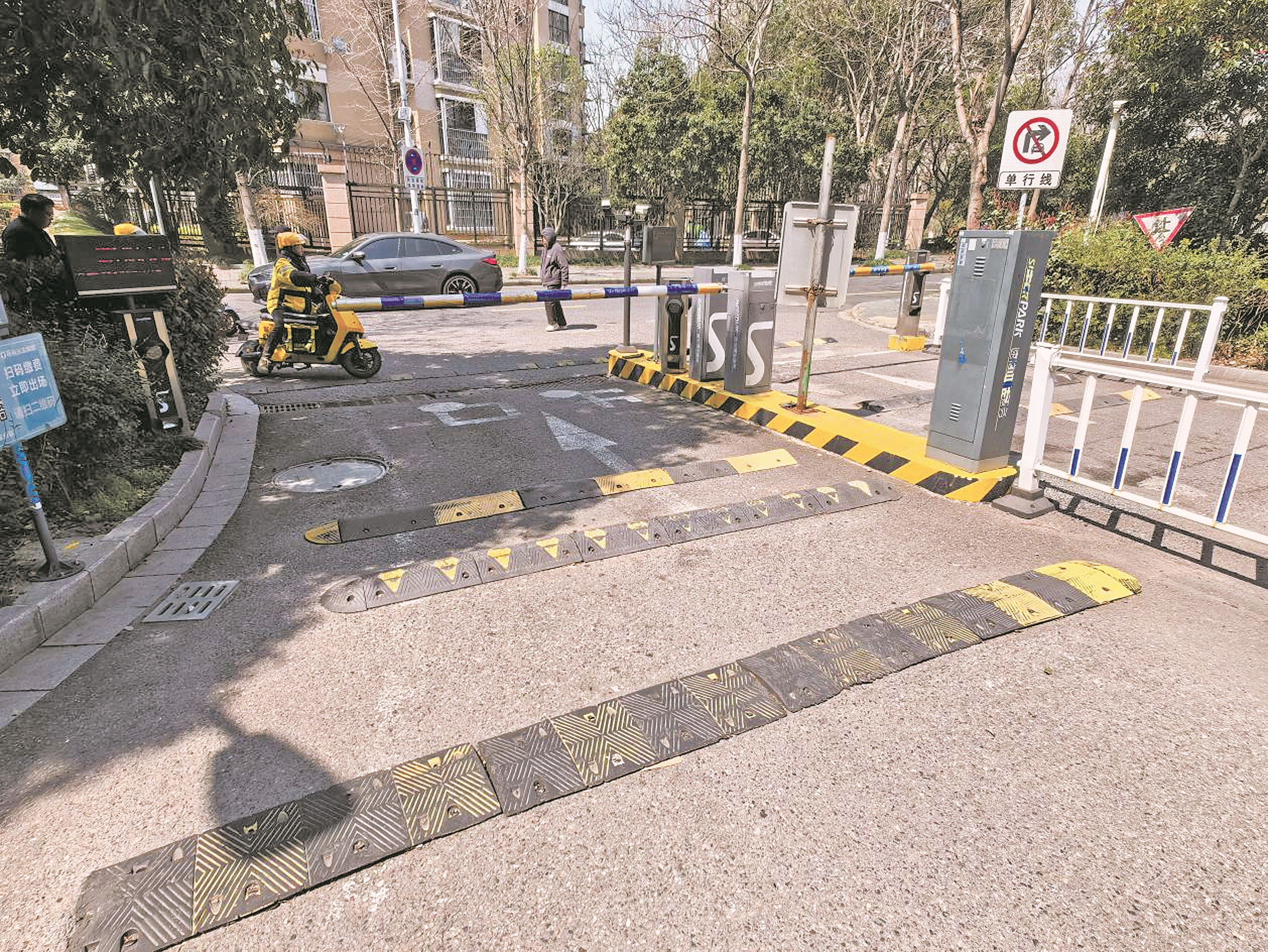鄞州万达广场北侧的地面停车场,入口、出口各装了5条减速带。记者开车体验,感觉减速带特别硬,还有点高,车子“哐哐”地颠得厉害。值守的保安直言不讳,过这些减速带确实很颠,不少车主有抱怨,但很多年了一直是这样安装的,一是限制车速;二是防止跟车逃费发生。前车缴费驶离,道闸杆子缓慢放下、复位,这中间有延时,留出约一个车身的空档。如果后车跟得近,没有减速带阻车,很容易就跟着溜出去了。
