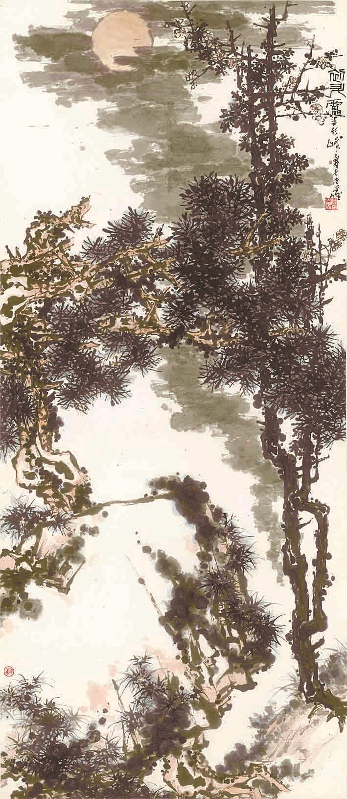 这种“造险”“破险”的构图哲学,在巨幅作品《松月梅图》中化作更精妙的视觉游戏。墨梅从右下角直上天空,松树自左路而上,而又作斜势崎岖而落,横贯全幅。左下角嶙峋山石如同压舱石,将险峻之势稳稳锚定,中央大块留白却似月影流云,将观众的视线引导到左上角的“画眼”,一轮圆月,整幅画作便有了灵魂和核心,“半空月影流云碎,十里梅花作雪声”的意境跃然纸上。