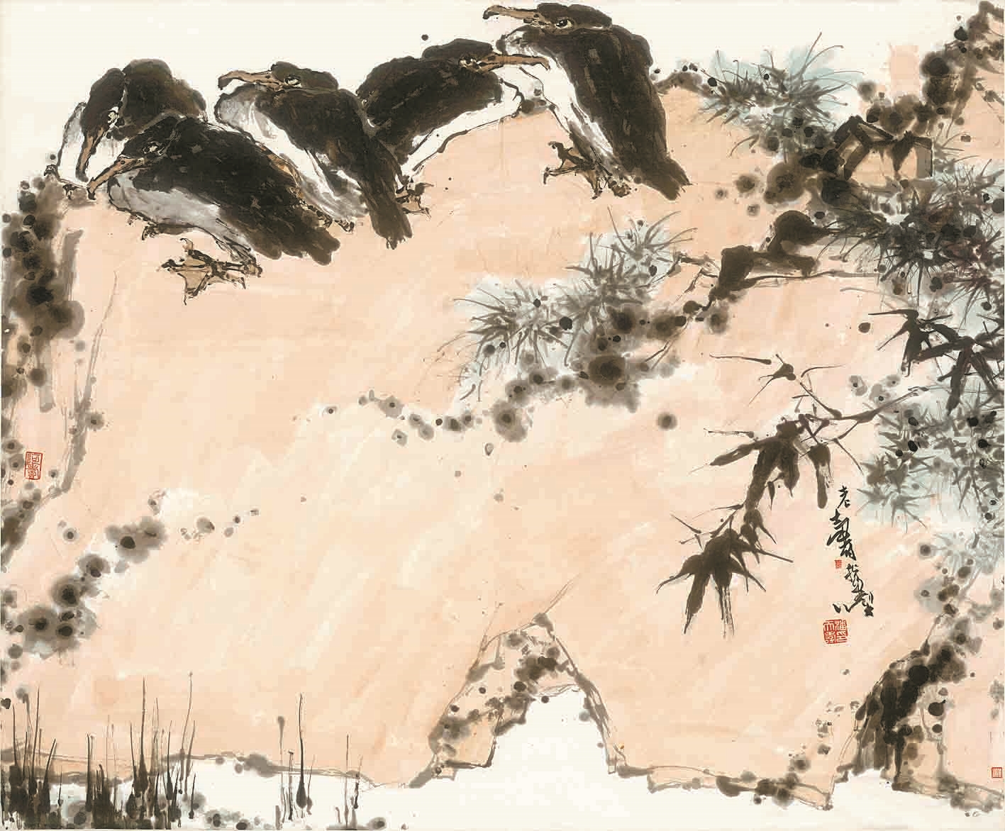 潘天寿的指墨技法到后期更显雄浑气魄。《五鹚图》中五只挤作一团的鹚鸟,看似潦草的墨点经指腹揉搓,竟呈现出羽毛的蓬松质感,这种“以皮肉为笔锋”的创作,让水墨在失控与掌控间迸发原始张力,恰恰成就了画笔无法复制的野性之美。
