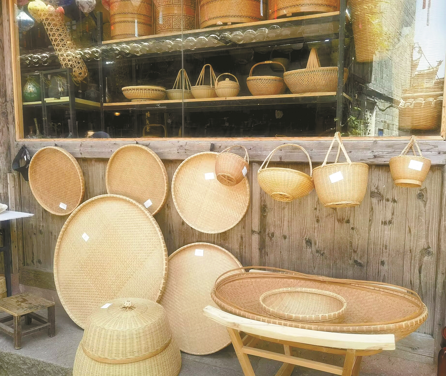 那年,阿爷大女儿出嫁,阿爷早就编好了一套嫁妆,针线笸箩、礼篮、蒸笼、竹箱、竹席……漆成红色的篾条穿插其间。有的器物收边时编了一圈漂亮的红色花纹,有的器物在提把或盖子上嵌入了红色“囍”字,看起来那么喜气祥和。