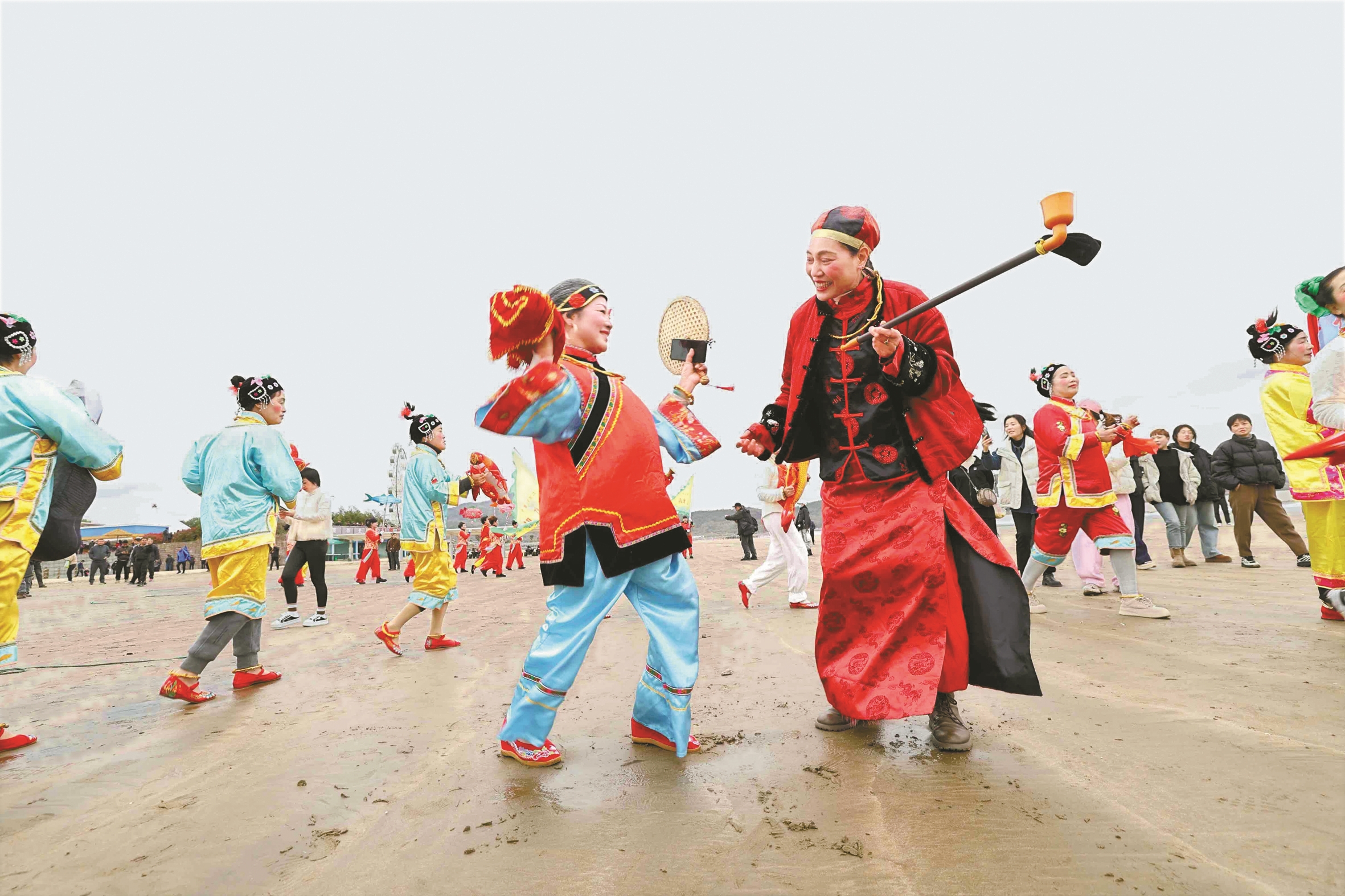 昨日是农历三月初三,“三月三·踏沙滩”民俗盛典在象山石浦镇的皇城沙滩上如期举行。作为石浦传承千年的传统民俗活动,“三月三·踏沙滩”于2009年入选省级非物质文化遗产保护代表性项目名录。今年的活动以“踏沙逐浪赴春约”为主题,通过30余项沉浸式文化体验活动,让传统民俗与现代文旅碰撞出绚丽火花。当天的石浦皇城沙滩腰鼓震天、彩绸翻飞,民俗巡游队伍踏浪而来,石浦渔民敲渔鼓、舞鱼灯、抬彩阁,尽情展现石浦渔港海洋渔文化。