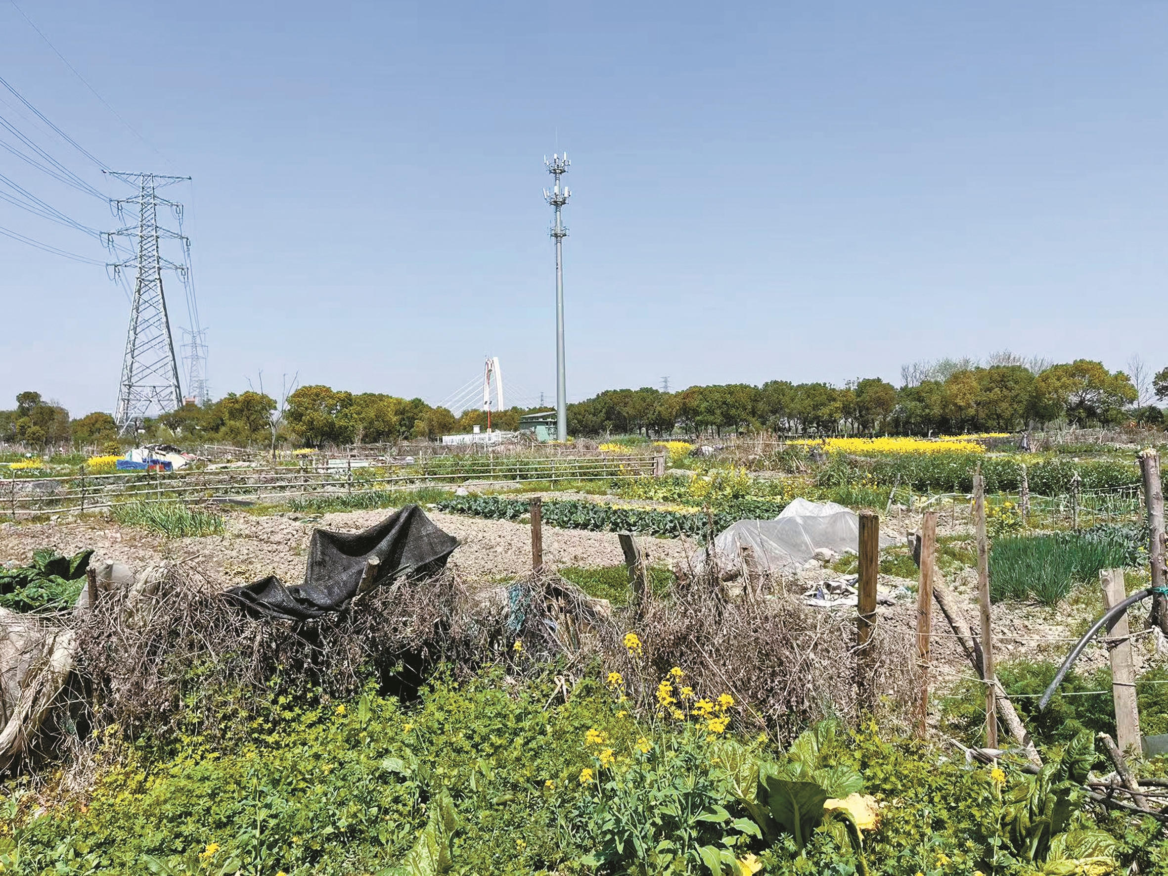 该地块靠近通途西路一侧,有一排高压铁塔巍然矗立,铁塔下开垦出来的菜地,分布更为密集。在菜地的周围及没有种菜的空地,杂草丛生,各种垃圾随处可见,一眼望去,十分刺目。