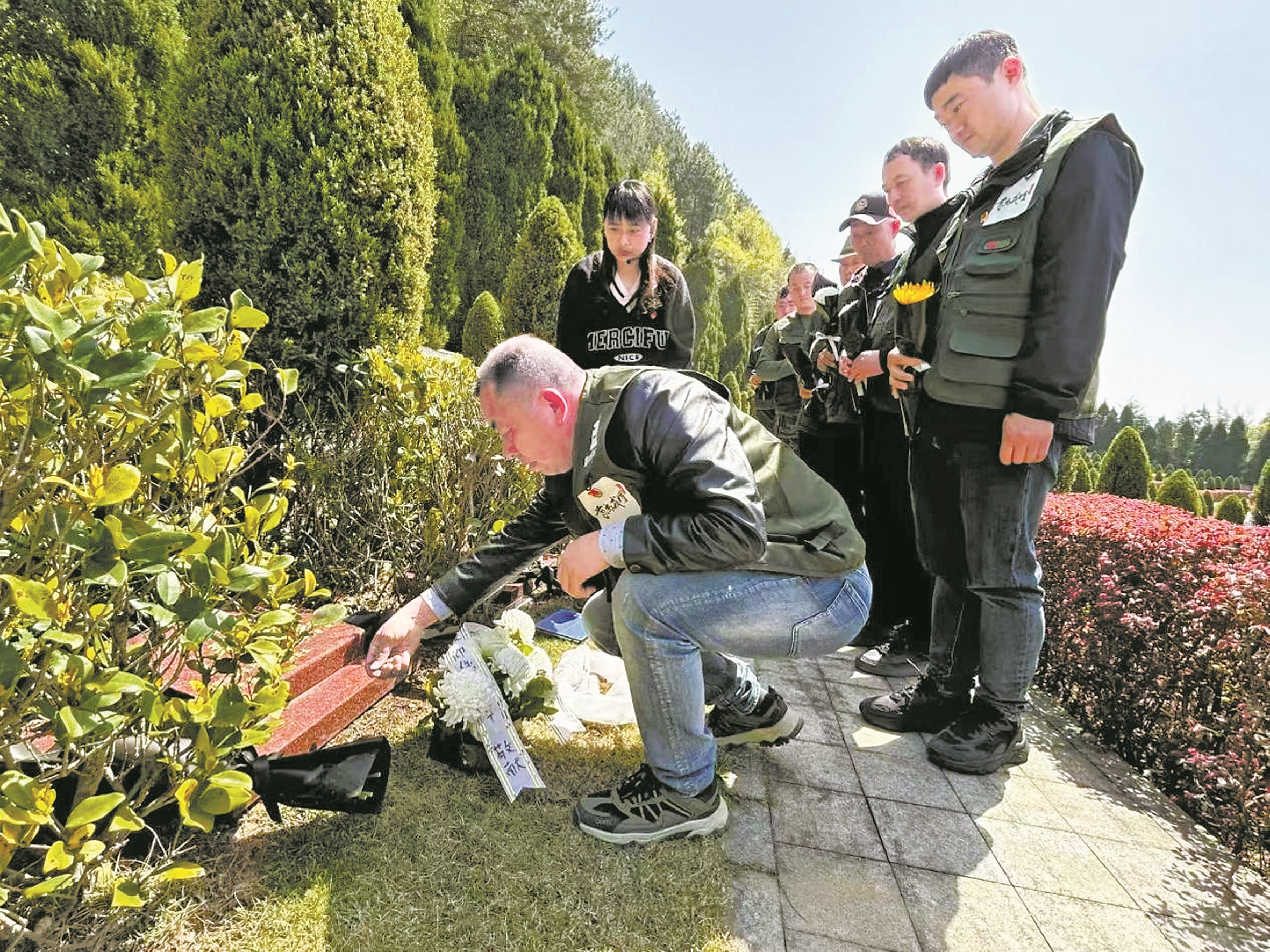 陵园内,青山环绕,翠柏挺拔,一方方烈士墓静静地伫立在这片庄严肃穆的土地上。在一方烈士墓区前,孙嘉怿耐心地给孩子们示范,细致地为墓碑上的字迹描红,并轻声与孩子们交流。