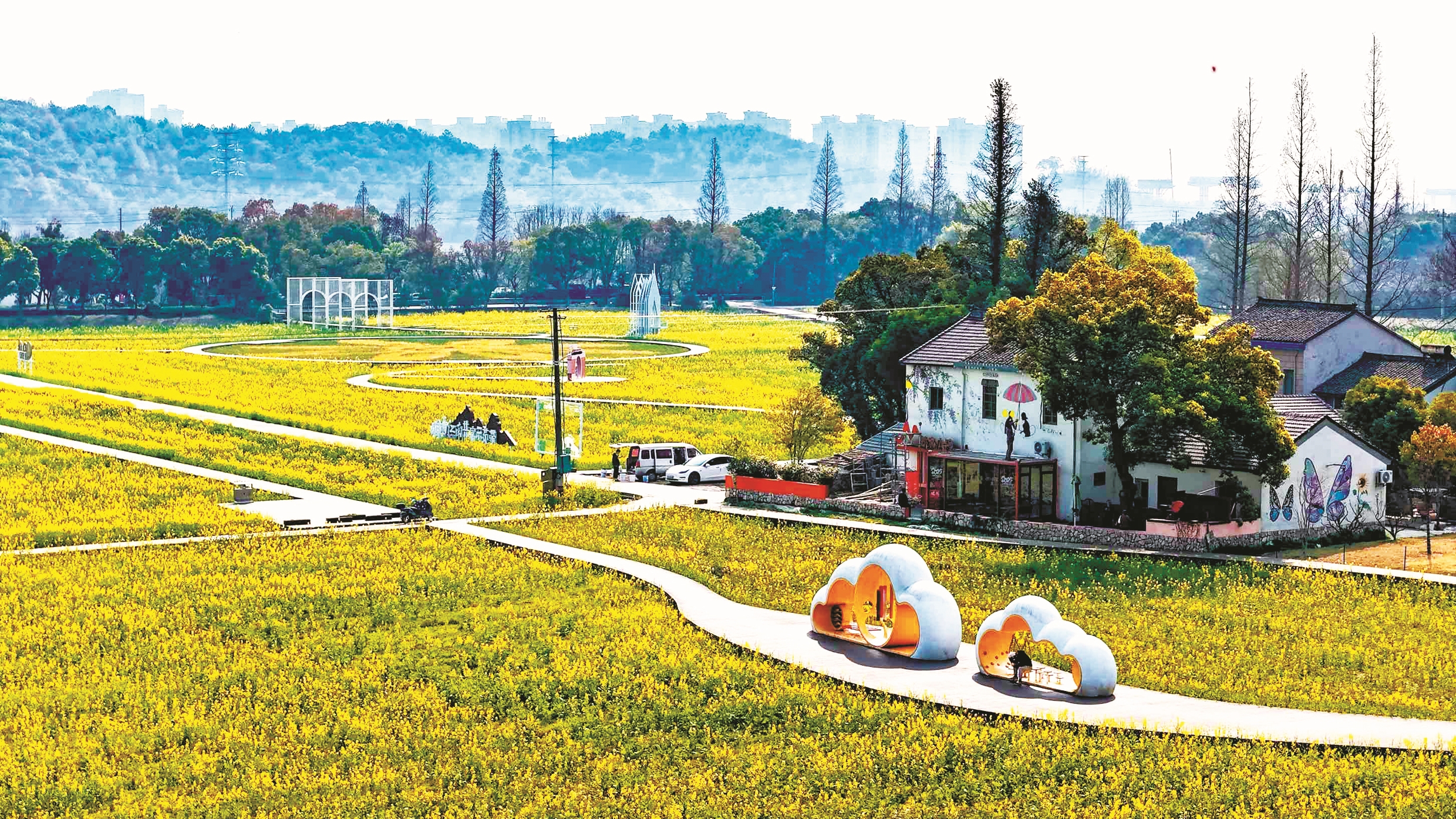 近年来,九龙湖镇充分发挥当地资源优势,不断探索“赏花+”农旅融合新模式,通过“一花一韵一主题”特色节点,并拓展骑行、爬山等绿色运动方式,将赏花点位串联成线,带动周边农家乐、村咖、文创店等发展,让村庄绽放乡村振兴的绚丽春色。图为九龙湖镇孟家花海。
