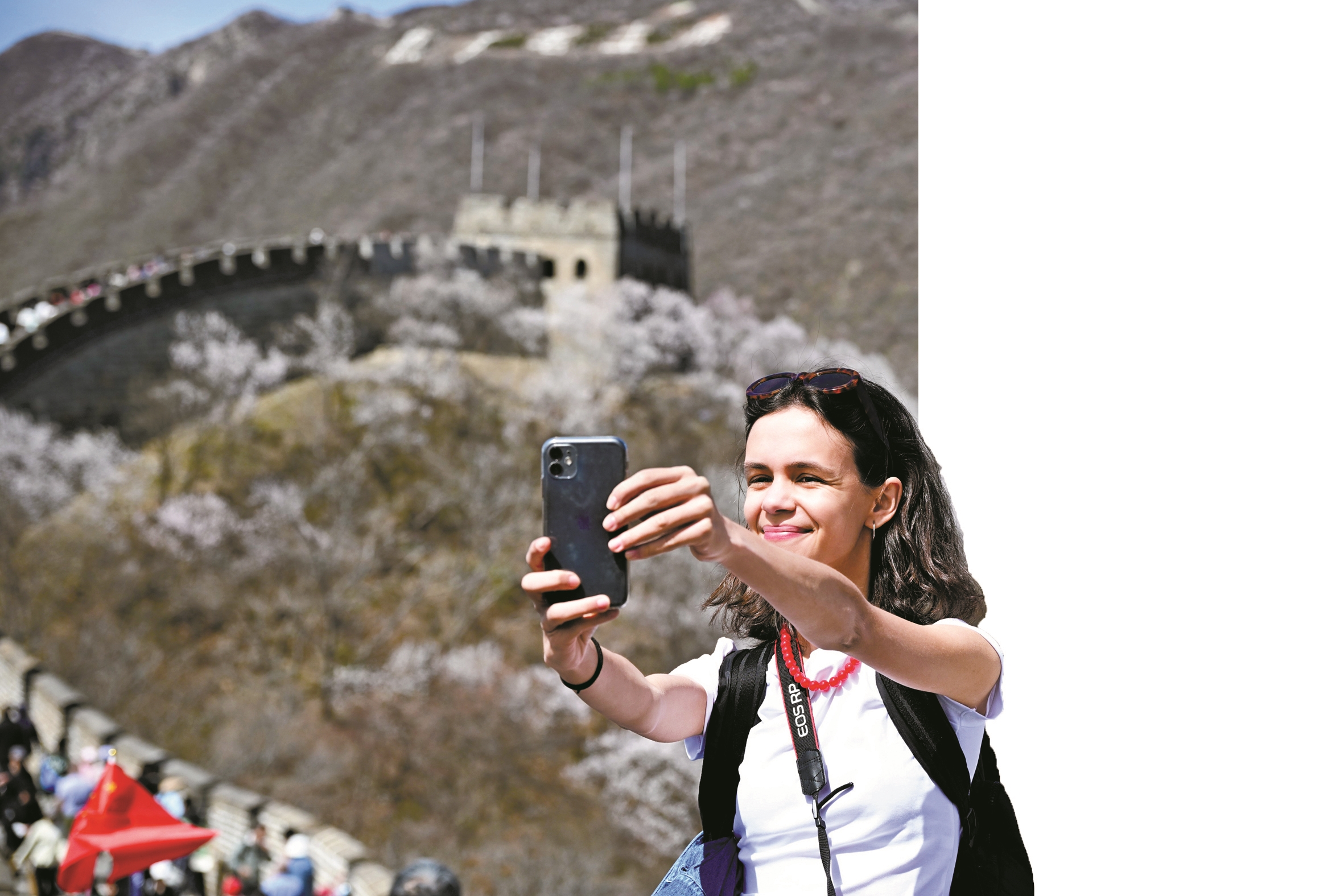 4月5日,外国游客在北京慕田峪长城游览。(新华社发)