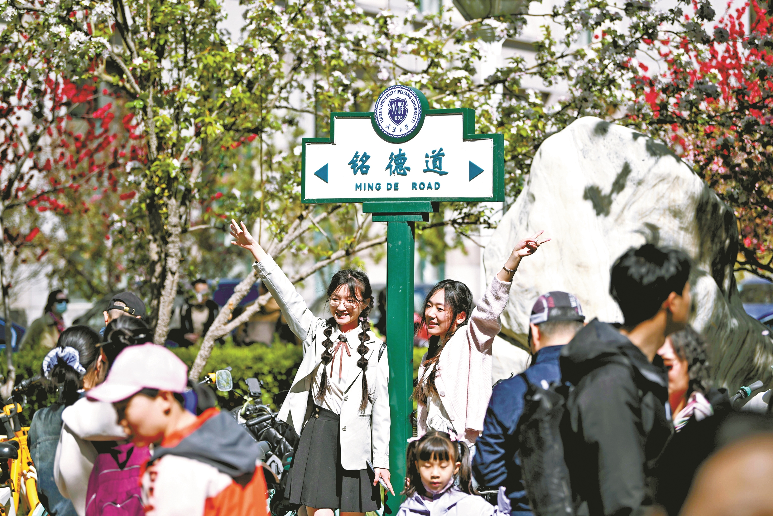 4月5日,游人在天津大学卫津路校区赏花留影。(新华社发)