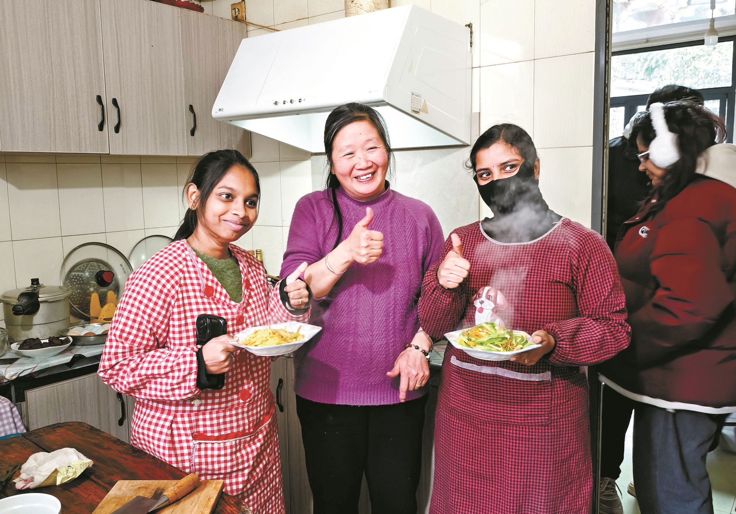 随后,在姜红升组织下,这些“洋学生”还来到钟云燕的家中,帮着她一起择青菜、切土豆丝,跟着她学做中国农家菜。一人一碗“学习成果”端上来,放满了整张圆桌。钟云燕家的小小厨房,装满了“洋学生”的爱。