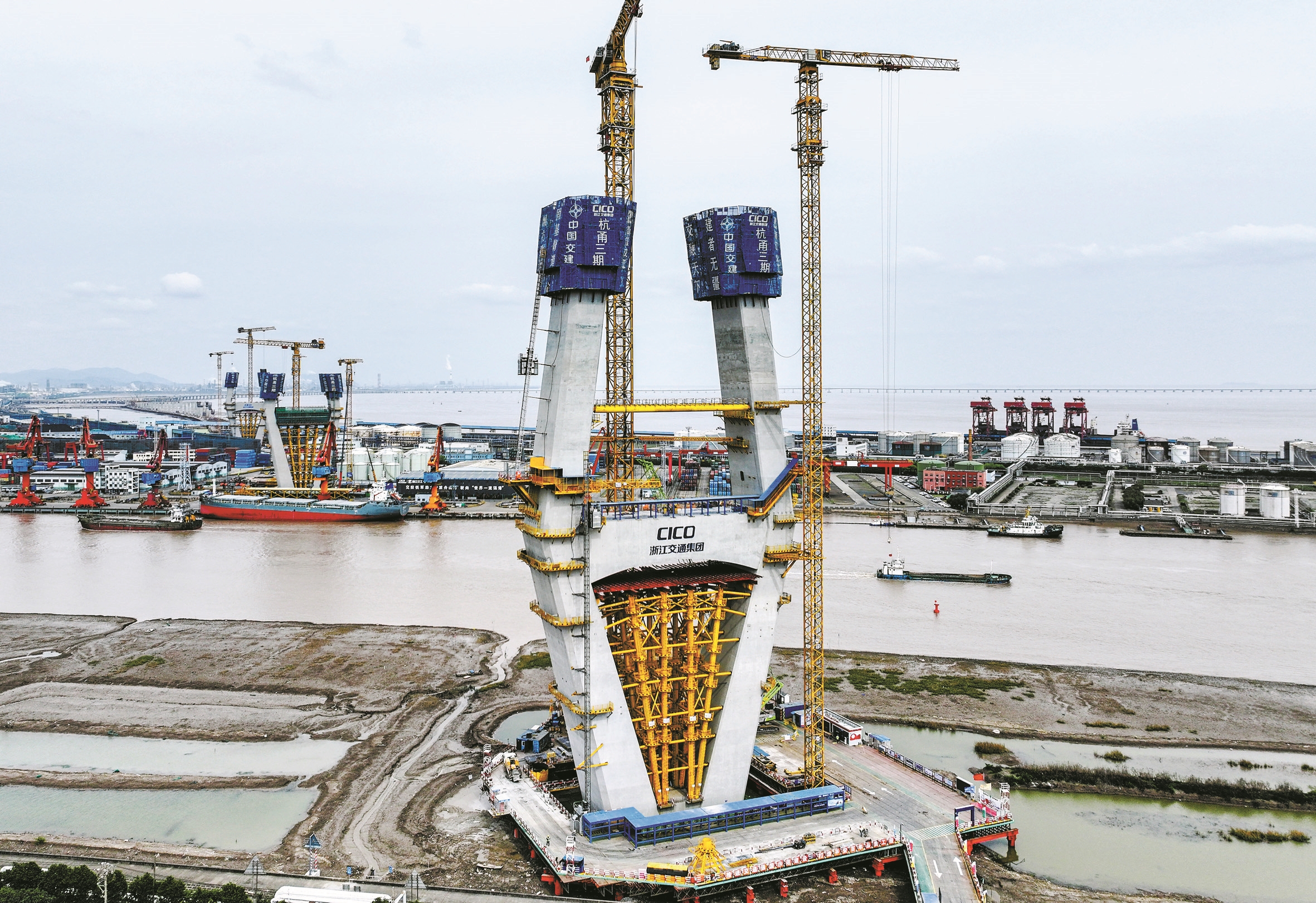 近日,杭甬复线宁波三期项目甬江特大桥主塔建设如火如荼,工人在百米高空进行施工。据了解,甬江特大桥设计为主跨540米+570米三塔方案,塔身采用大倾角钻石型结构,由下塔柱、中塔柱、塔冠、下横梁组成,最高达223米,该桥梁是目前世界上最大跨径的不对称三塔斜拉桥。据悉,60号索塔施工高度已超百米,为后续主塔封顶及钢梁架设奠定了坚实基础。(唐严 姚峰 陈芊 摄)