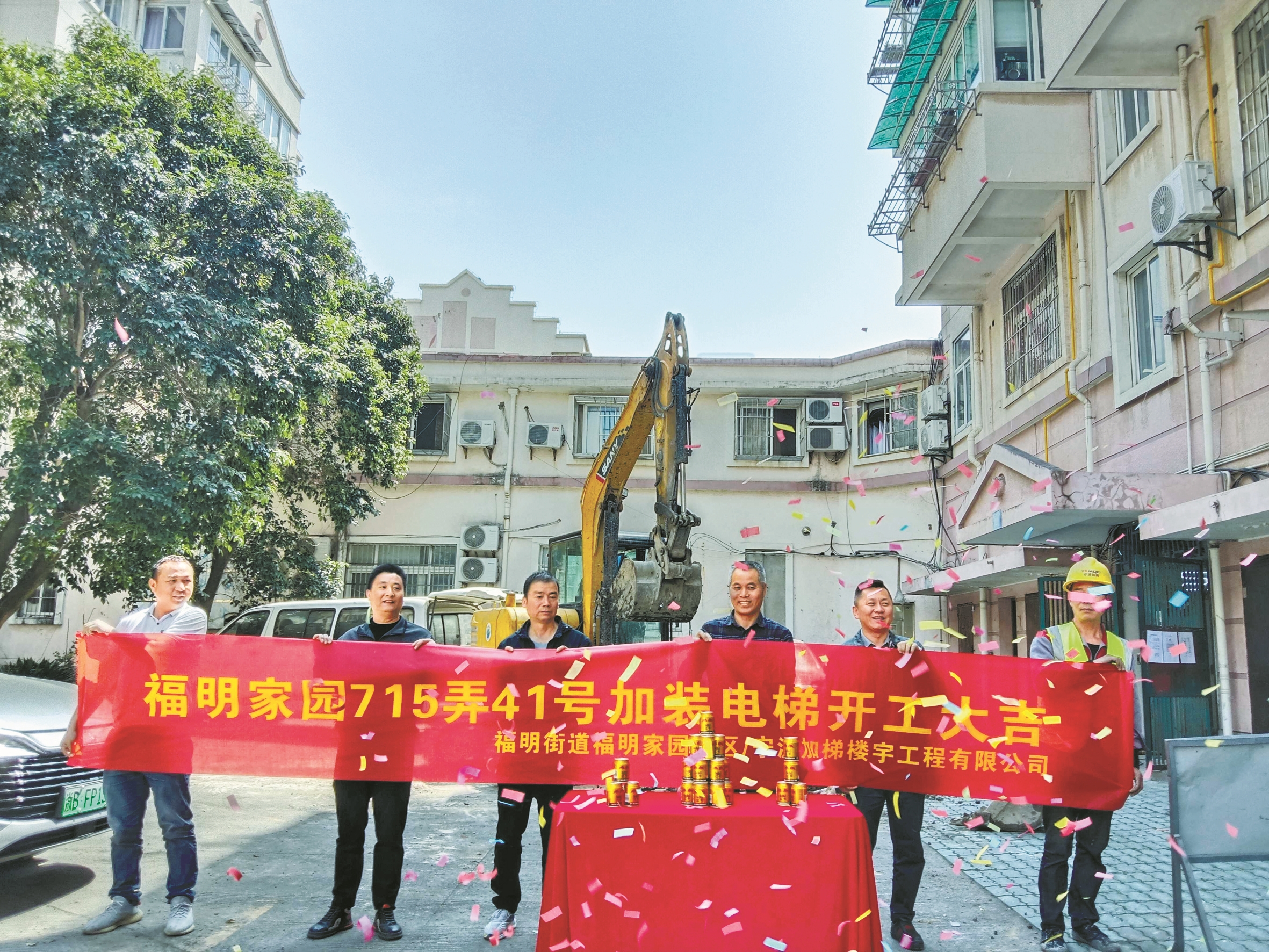 4月7日,鄞州区福明街道民安路715弄41号墙门举行了一场特殊的电梯加装开工仪式。几名业主自掏腰包,制作横幅,买来礼花筒、红牛饮料,一起庆祝这个难忘的时刻。
