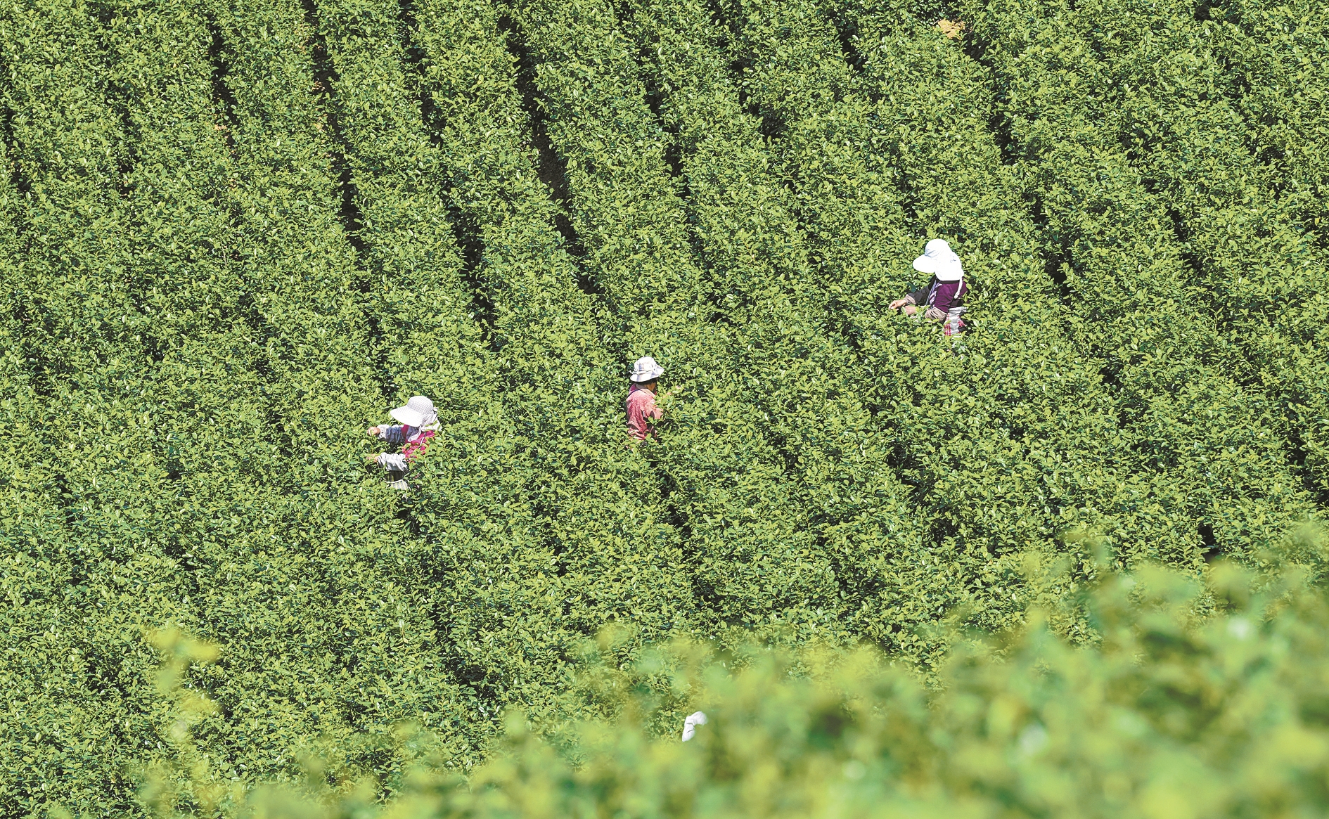 Tea plantation is bustling with activity during its peak season. [Photo by Wang Jiabin]