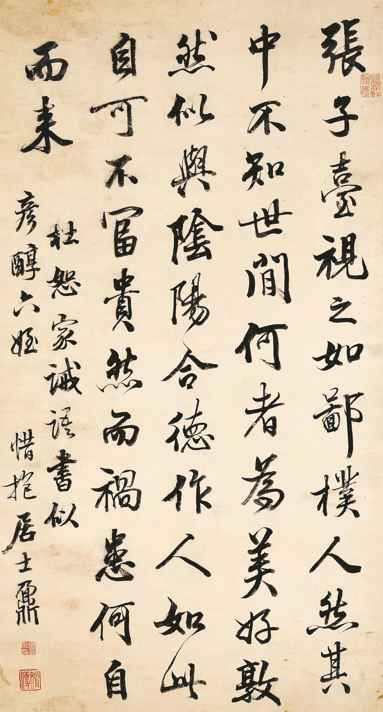 姚鼐与王文治均以行书见长,如姚鼐行书《杜恕家诫》与王文治行书风较接近,二者都取“二王”书法,尤对王羲之《兰亭序》下过功夫,《杜恕家诫》笔画瘦劲,字形秀美,笔法讲究,结体方长而平中见奇,虽字字独立,但气脉通畅。而行书《北江诗话一则》,总体承继了“二王”帖学之风,书家传统功力深厚,法度谨严,笔画牵丝引带清晰,但在字形、线质及用笔节奏上与《杜恕家诫》不同,取法上吸收唐李邕、颜真卿及北宋苏东坡书法更多一些,此作在书写节奏上还流露出书家淡淡的抒情意味。