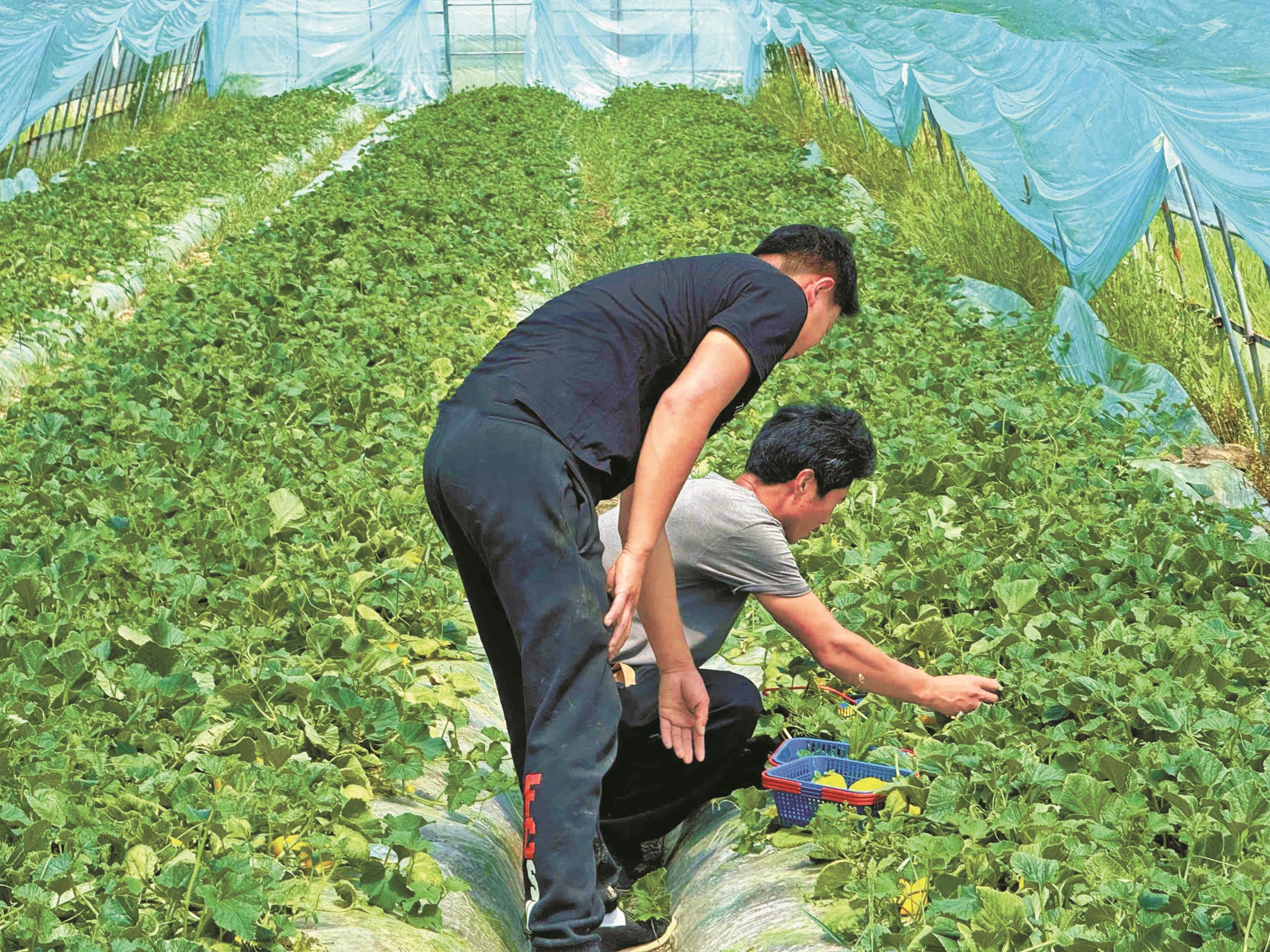 图为基地种植人员正在采摘甜瓜。