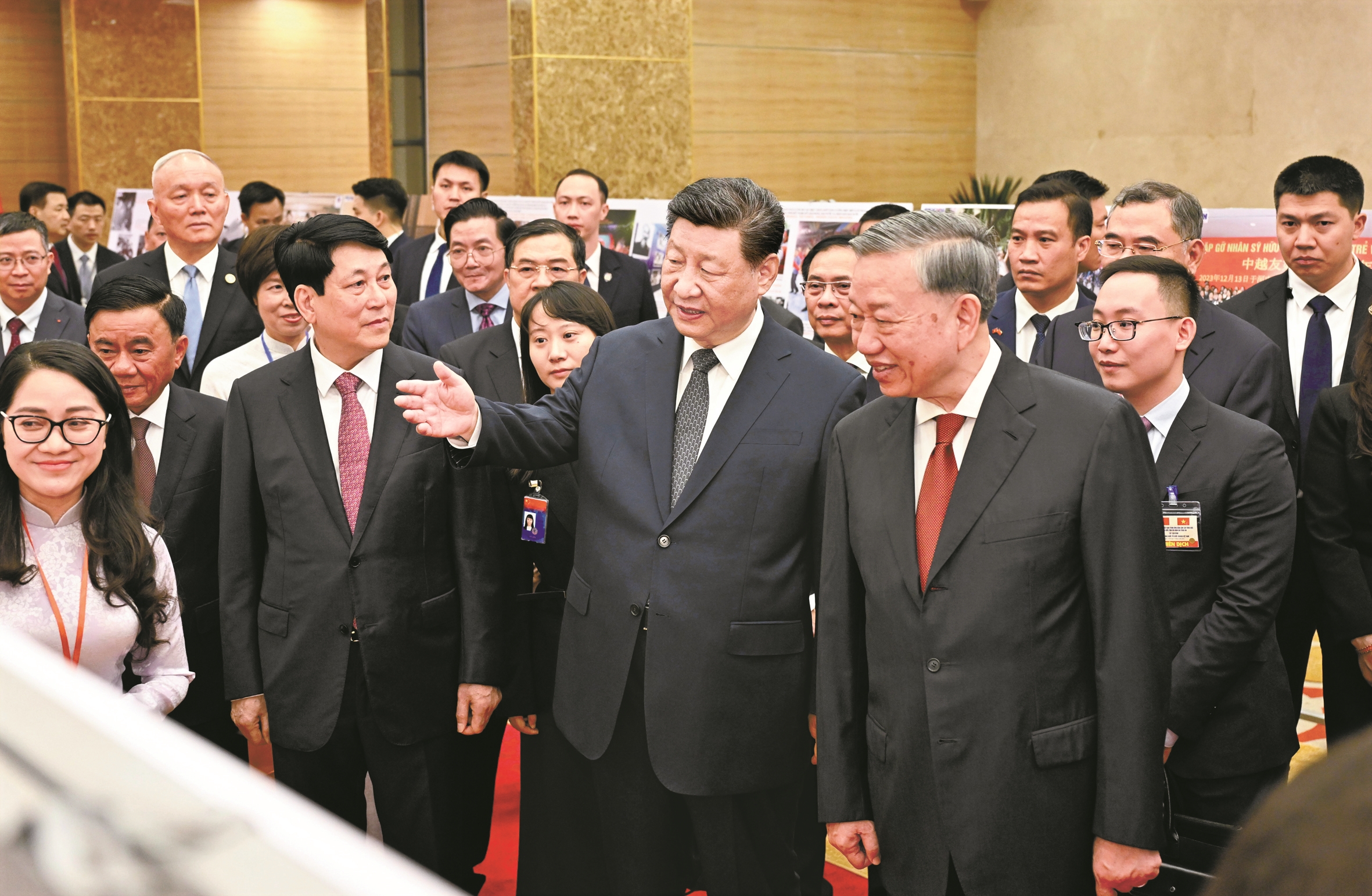 4月15日上午,中共中央总书记、国家主席习近平在河内国际会议中心同越共中央总书记苏林、越南国家主席梁强共同会见中越人民大联欢活动代表。这是活动前,习近平在苏林、梁强陪同下,观看中越建交75周年图片展。(新华社记者 殷博古 摄)
