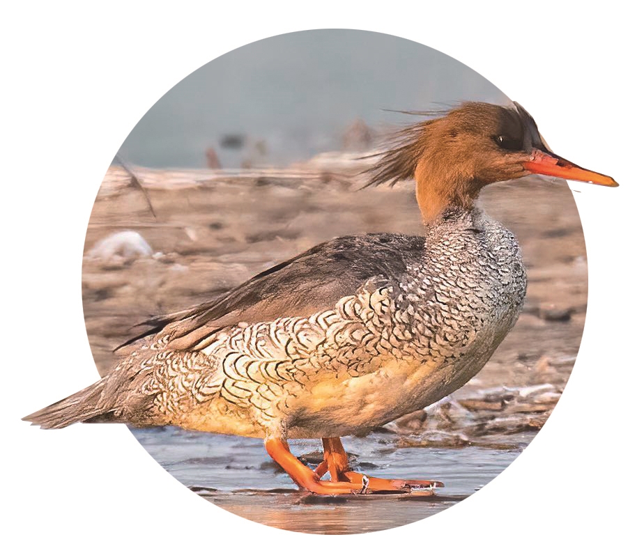 中华秋沙鸭(雌) 体长52-62厘米,偏好有砾石滩的环境。雄鸟头部呈暗绿色光泽,背部黑白相间;雌鸟头部锈褐色,背部灰色。两侧具独特的黑白鳞状纹,使其易于与其他秋沙鸭种类区分。冬候鸟。国家一级保护动物。 (胡小伟 摄)