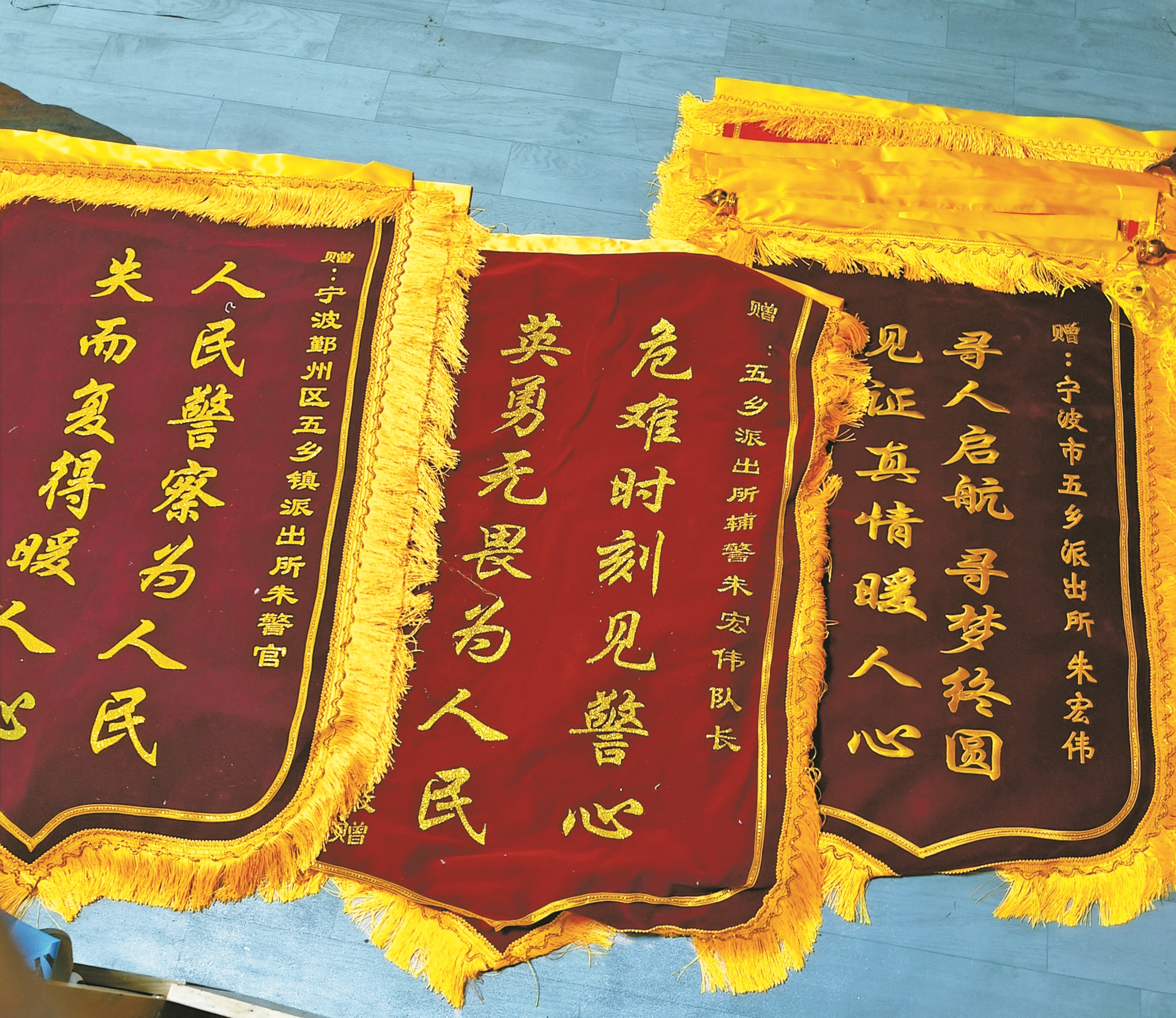 朱宏伟今年45岁,是一名新宁波人。他的老家在台州临海,1992年随同父母来甬承包农田搞种植业。2000年,他来到五乡,将青春挥洒在这片土地上。因为向往帅气的警服,2011年3月,他加入公安系统,成为五乡派出所的一名辅警。他人生的第一面锦旗,就是在这一年获得的。