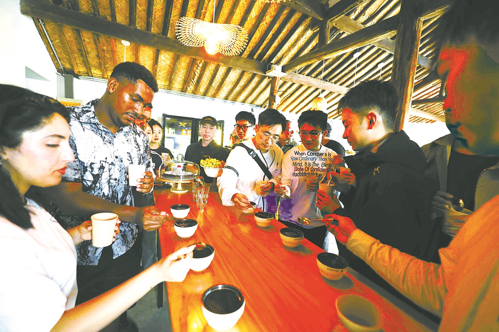 图为外国师生正在品尝咖啡。