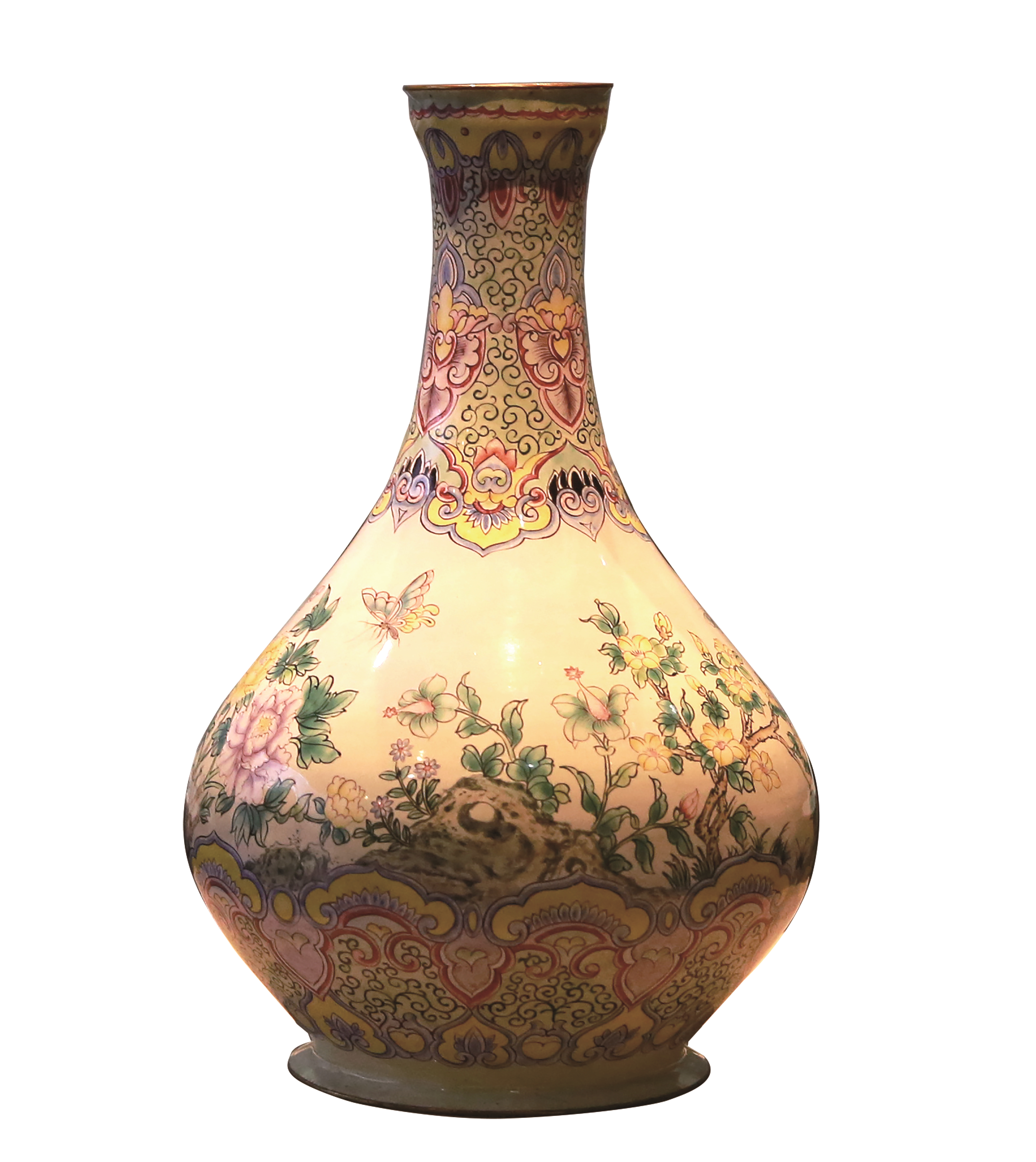 受当时西方影响,本次展出的瓷器华丽非凡,另一种类别——铜胎画珐琅,更是炫彩夺目。画珐琅艺术通过中西贸易进入中国后,丰富了原有的珐琅技法,在康熙、雍正、乾隆三朝发展出不同的风格,并逐渐走向奢华繁缛。