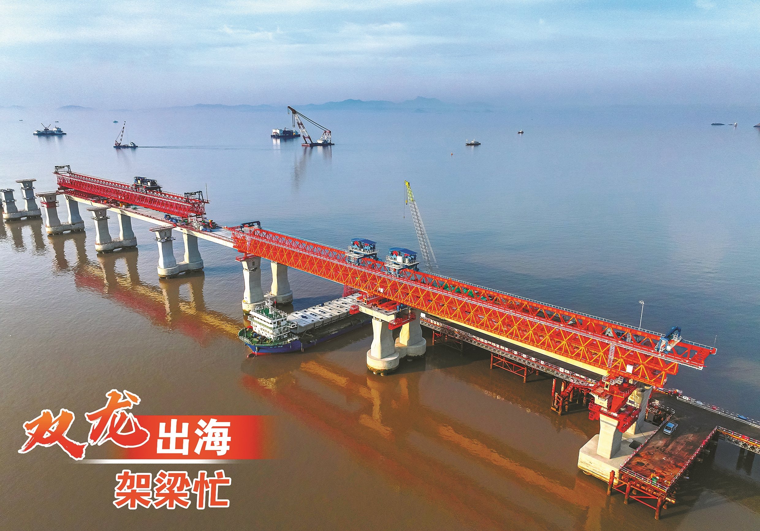 近日,在宁波舟山港六横公路大桥二期工程青龙门特大桥西引桥施工现场,两台架桥机正在进行节段梁吊装,犹如“双龙出海”。六横公路大桥分为一、二两期,二期工程包含青龙门大桥和双屿门大桥两座世界级跨海桥梁。该项目全部建成并通车后,梅山、六横及佛渡将结束不通高速的历史。该项目预计于2027年竣工,届时,六横至宁波的通行时间将由原来的船渡40分钟缩短至车行10分钟,将有效推动甬舟一体化联动发展。