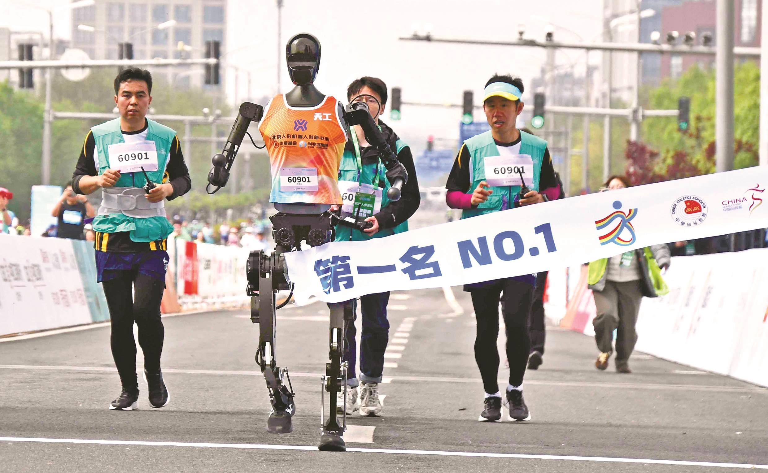 4月19日,天工队选手天工Ultra(左二)在比赛中冲过终点。