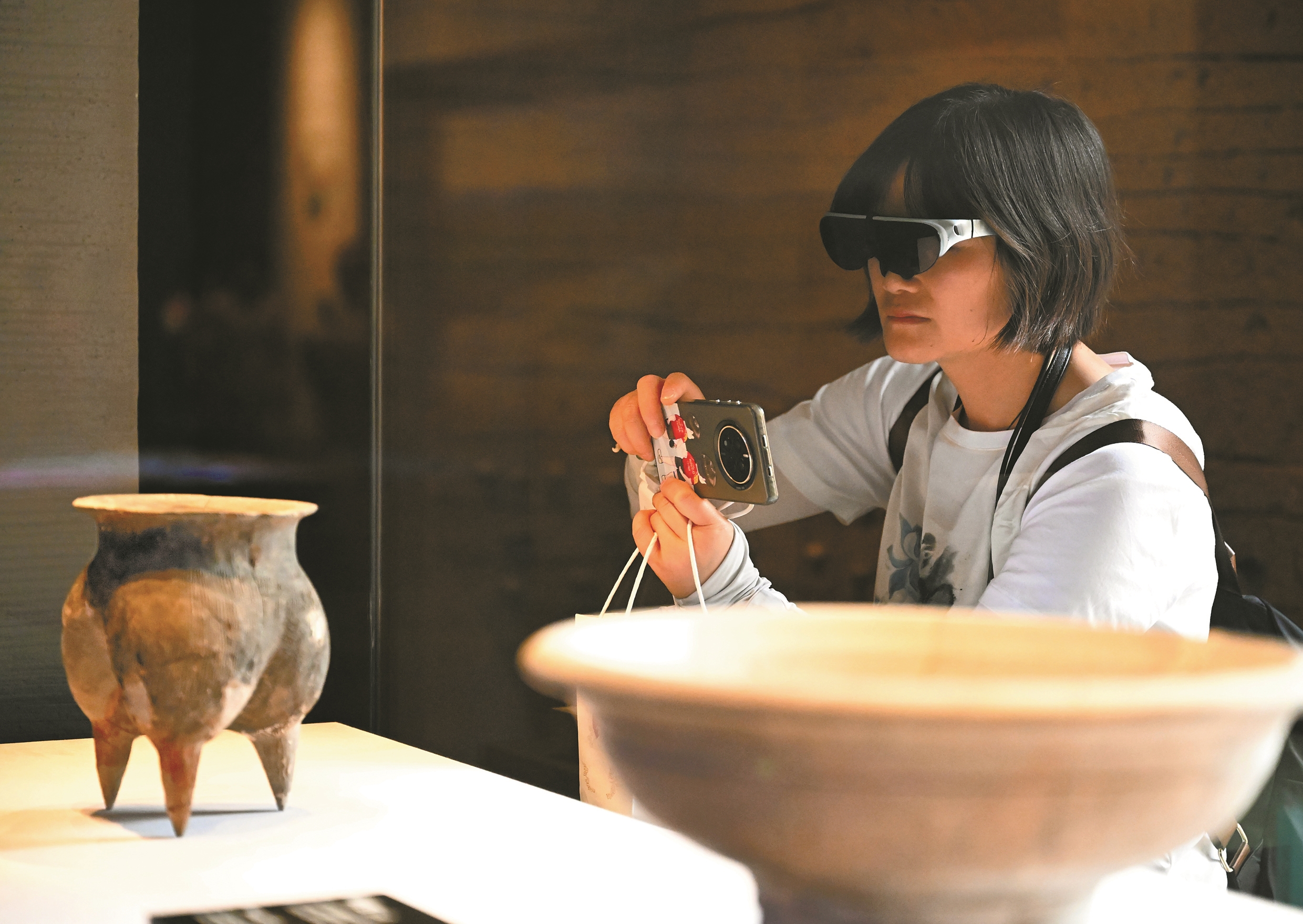 2025年4月16日,游客佩戴智能眼镜在位于河南省洛阳市偃师区的二里头夏都遗址博物馆参观。(新华社记者 李嘉南 摄)
