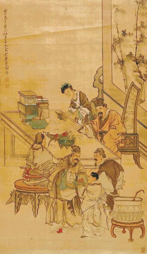 任薰的《四相簪花图》画于光绪二年(1876)。簪花终究是一种时尚,在唐宋达到鼎盛,元代以后,这种习俗逐渐式微,明代更是删繁就简。到了晚清,对于男子簪花,市民百姓恐怕只有回味的份,很少再去效仿了。不过,寓意吉祥富贵的画作,不会没有市场,尤其在上海这样的十里洋场,况且此时任薰的画技已臻于成熟,正处在创作的黄金时期。看他的《四相簪花图》,用笔取陈老莲技法,沉着有力,流畅劲利,线条功夫极为老练,游丝描、兰叶描如同书法中的行草,给人以行云流水之感。又能笔随意转,开辟广阔盎然的意境。《四相簪花图》结构严谨,屏风、书案、坐椅以及人物的主从关系,安排得匠心而得体。于平淡中出奇,宁静中生动,整个画面呈现一种空灵明快之感。
