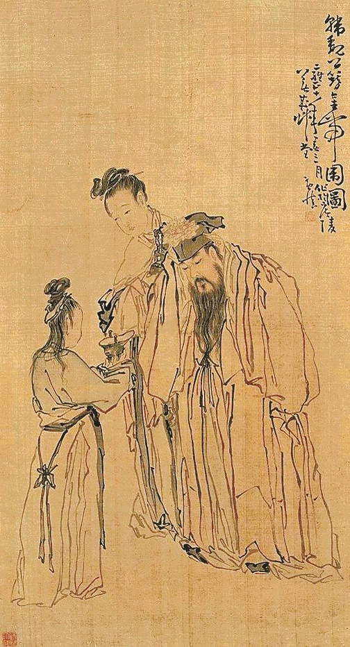 后来黄慎数次图绘过“四相簪花”这一典故,画史上有据可考的就有雍正十三年(1735)、乾隆二年(1737)、乾隆十九年(1754)等,目前仍有多幅同题画作留存于世。这些作品或为册页,或为立轴,或为纸本,或为绢本,但在构图与技法表现上有一定的相似之处。较为知名的是现藏于扬州博物馆的《韩魏公簪金带围图》,画于乾隆十九年正月,绢本设色,不过此图没有画王安石等三人,而是只画了韩琦正执金带围花簪于冠上,其面前及身旁另有两位女子,一位持酒壶,一位持酒杯。两人袅袅婷婷,烘托出簪花饮酒的雅兴。图中三人造型生动,线条流畅洒脱。