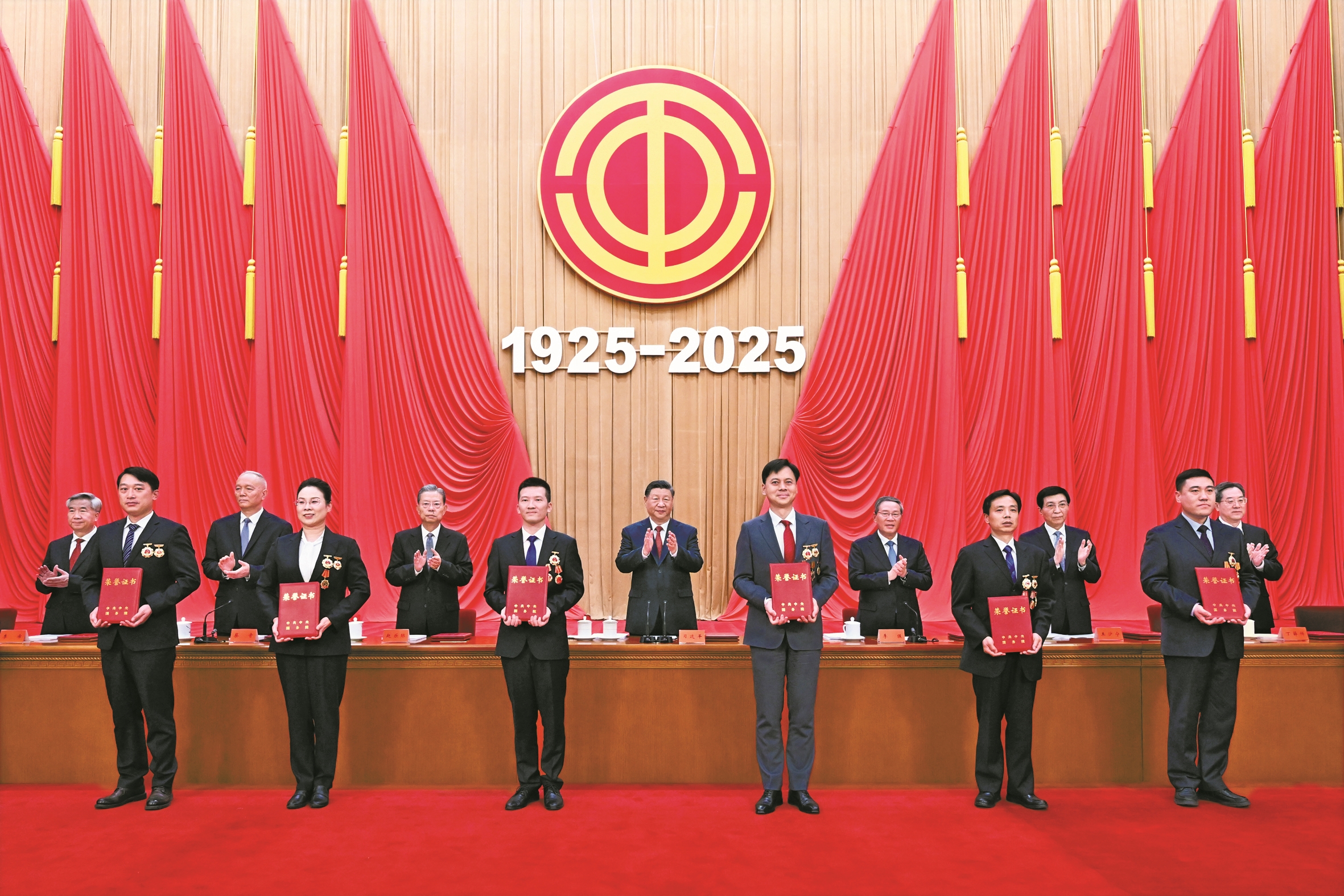 人民大会堂大礼堂气氛隆重热烈。主席台上方悬挂着“庆祝中华全国总工会成立100周年暨全国劳动模范和先进工作者表彰大会”会标,后幕正中悬挂中国工会会徽,会徽下方是“1925-2025”字标,10面红旗分列两侧。二楼眺台悬挂着标语:“以习近平新时代中国特色社会主义思想为指导,坚定不移听党话跟党走,在以中国式现代化全面推进强国建设、民族复兴伟业中充分发挥工人阶级主力军作用和工会桥梁纽带作用!”