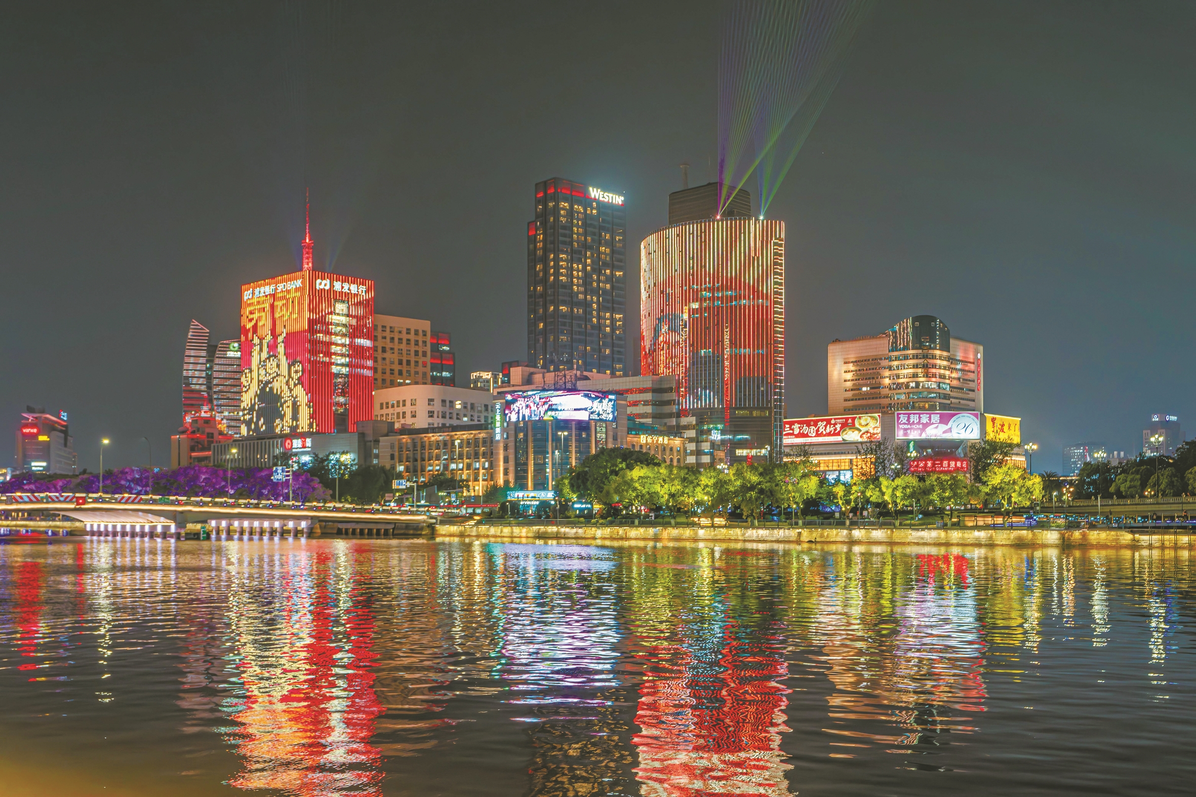 昨晚7时,“匠心筑梦”主题灯光秀在三江口核心区启幕,东部新城、南部商务区、镇海新城核心区、北仑中心广场、奉化主城区等地联动开展灯光秀。