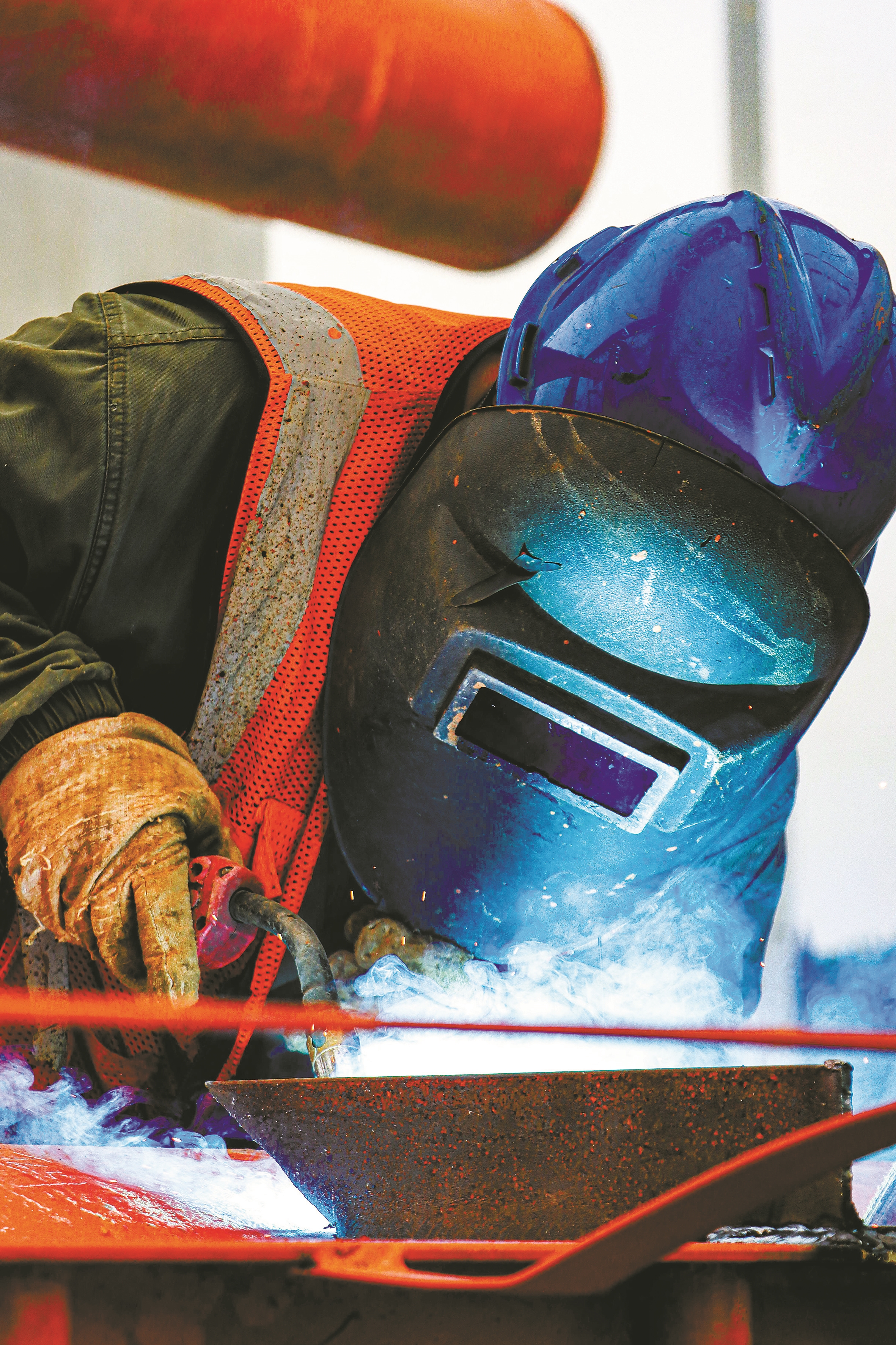 昨日,在杭州湾跨海铁路大桥海上施工平台,工人正在作业。 (王嘉彬 程帅 摄)