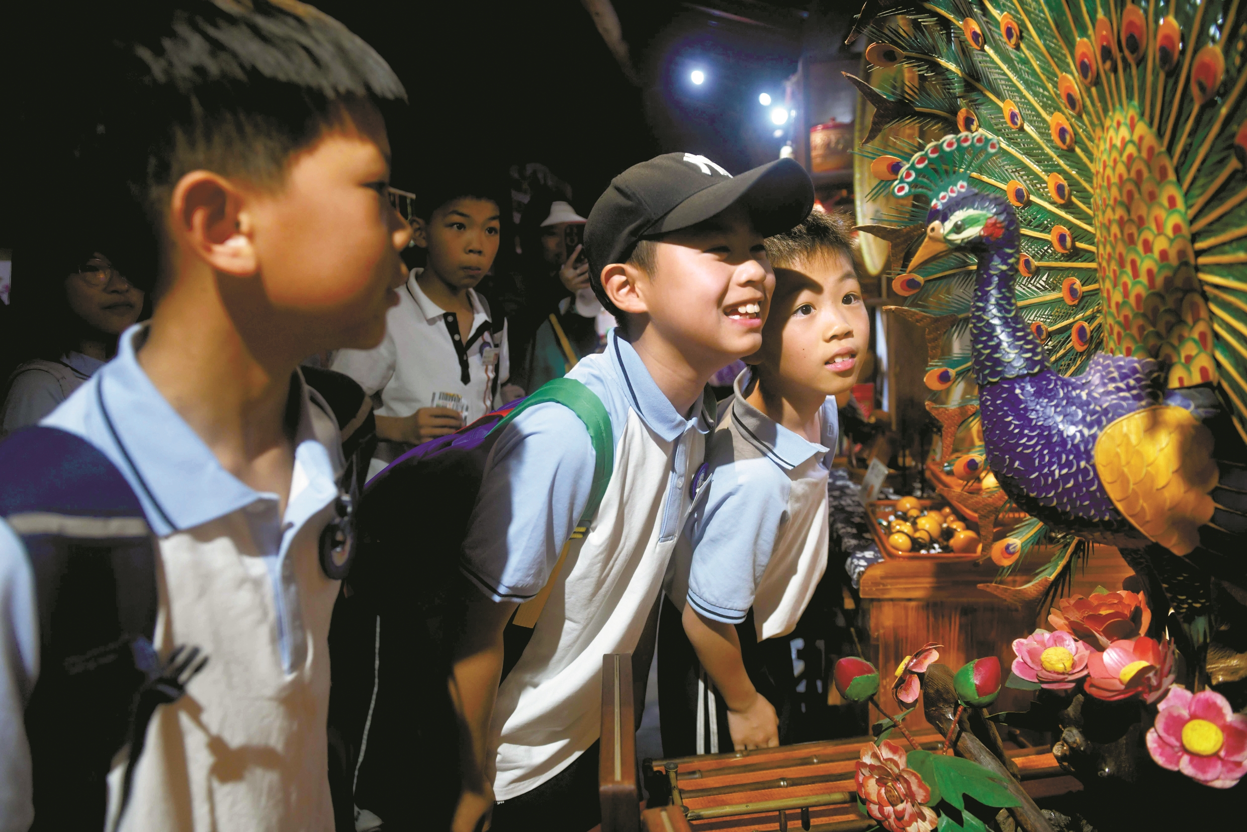 孩子们欣赏鄞州竹编非遗作品。 (黄银凤 摄)