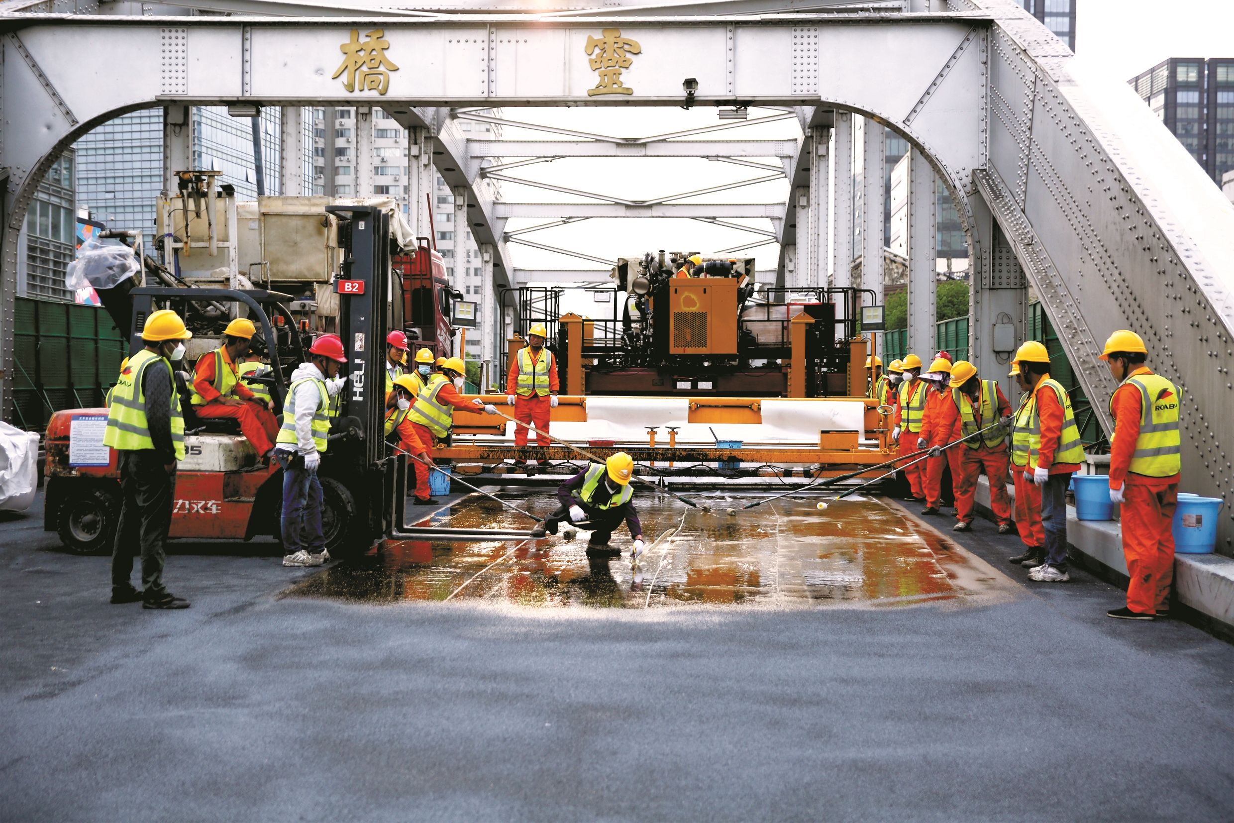 施工人员昼夜奋战,从旧铺装层的铣刨、环氧粘结层的破除,到钢桥面的抛丸除锈、防水粘结层的施工,再到改性聚氨酯混合料的拌和、摊铺、平整……每一个环节都凝聚着他们的心血和汗水。