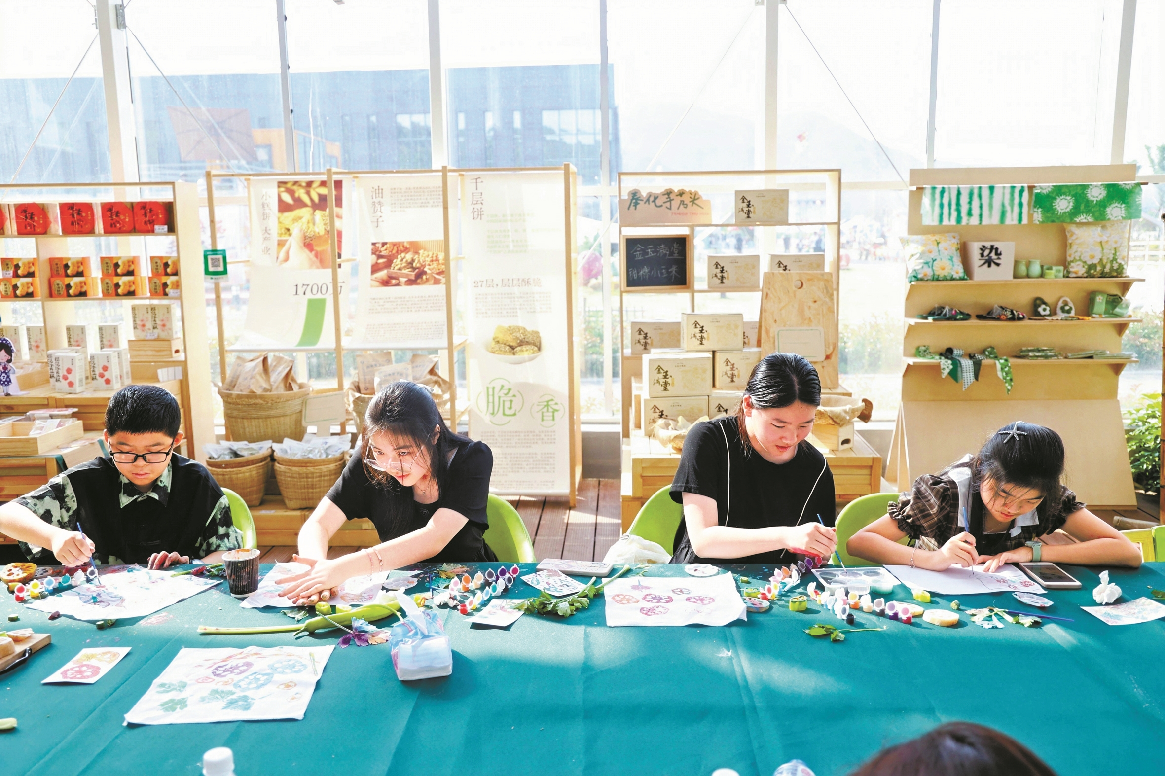“蓝染植物拓印”摊位前,孩子将菜叶拓印成趣味童画;“蔬菜套圈圈”游戏中,游客以趣味方式兑换基地绿色蔬菜。