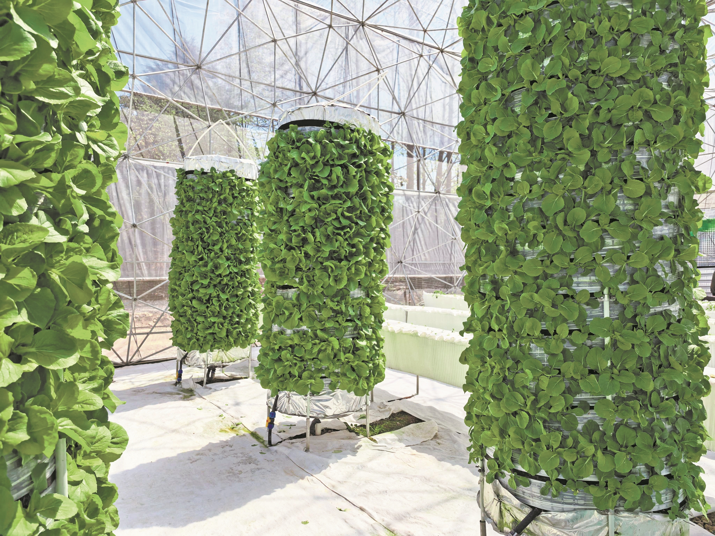 昨天,在余姚四明山镇梨洲村灵溪地块的“星链光合1号基地”大棚内,一排圆柱形立柱吸引了记者的目光。青菜、生菜等时令蔬菜在立柱上舒展嫩叶,呈现一派生机盎然的景象。“瞧这长势,再过三五天就能采收了!”基地技术员祝永辉指着绿油油的蔬菜笑着说。