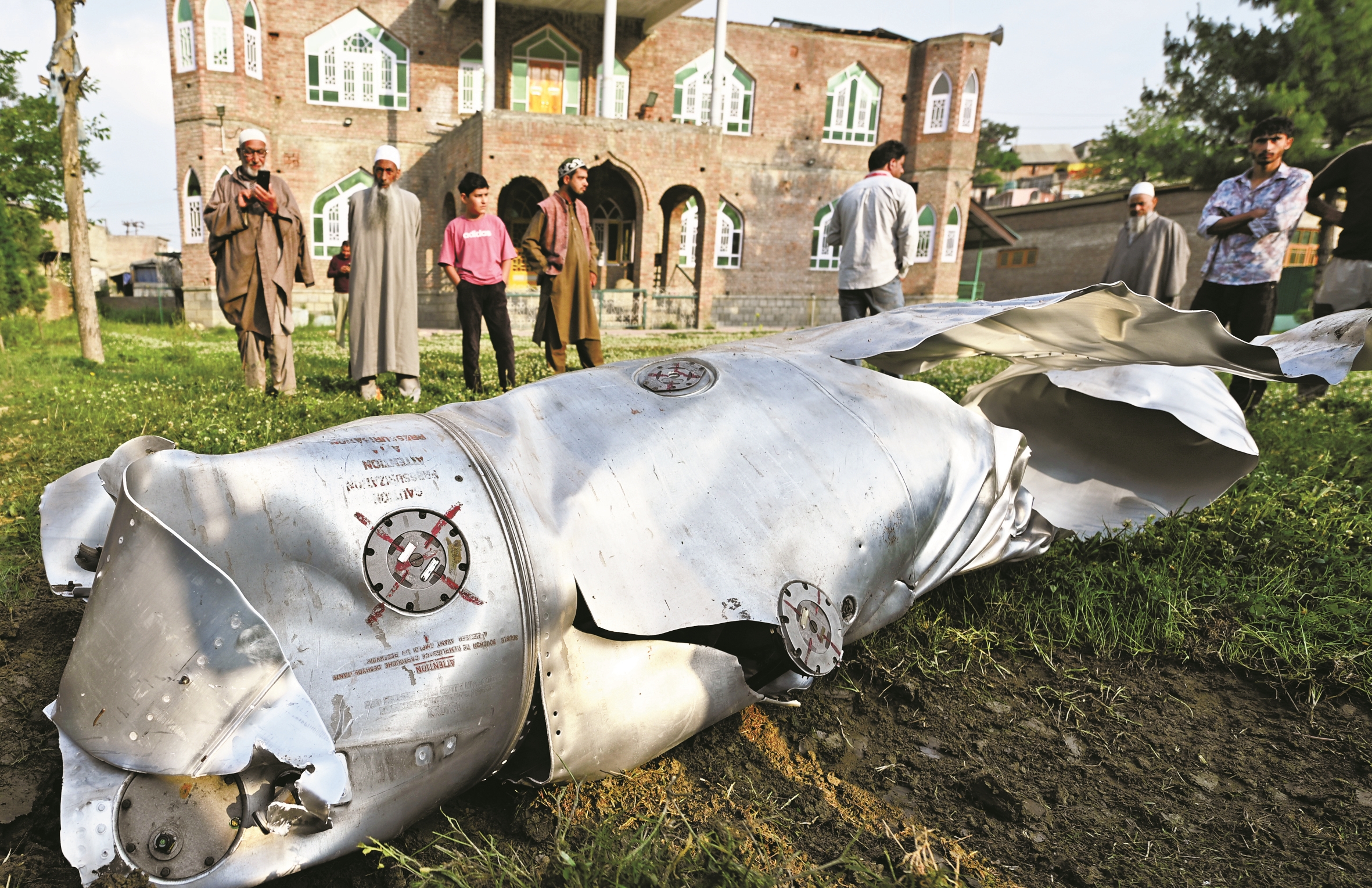 5月7日,在印控克什米尔首府斯利那加附近的普尔瓦马地区,人们围观飞机残骸。 印度媒体《印度教徒报》援引政府消息人士的话报道,至少3架印军战机7日在印控克什米尔地区坠毁。(新华社发)