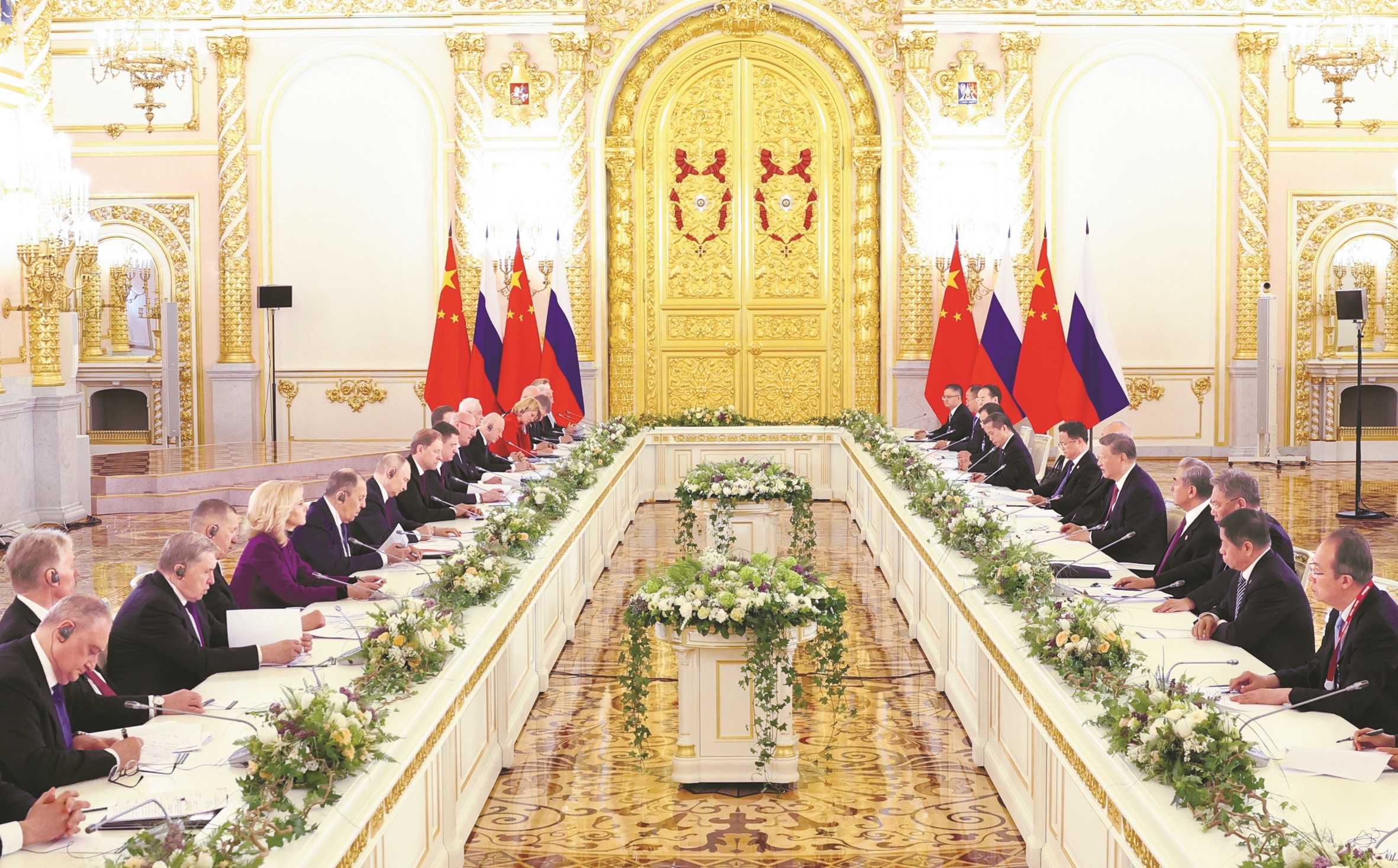 当地时间5月8日上午,俄罗斯总统普京同中国国家主席习近平在莫斯科克里姆林宫举行会谈。这是两国元首举行大范围会谈。(新华社发)